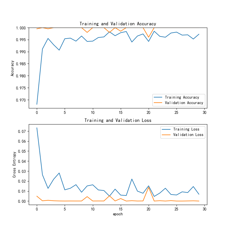 训练精度逐步提升并稳定,验证精度保持高水平,训练损失和验证损失较低,说明模型已经收敛并在训练和测试集上表现出色,验证了模型的稳定性和高效性。