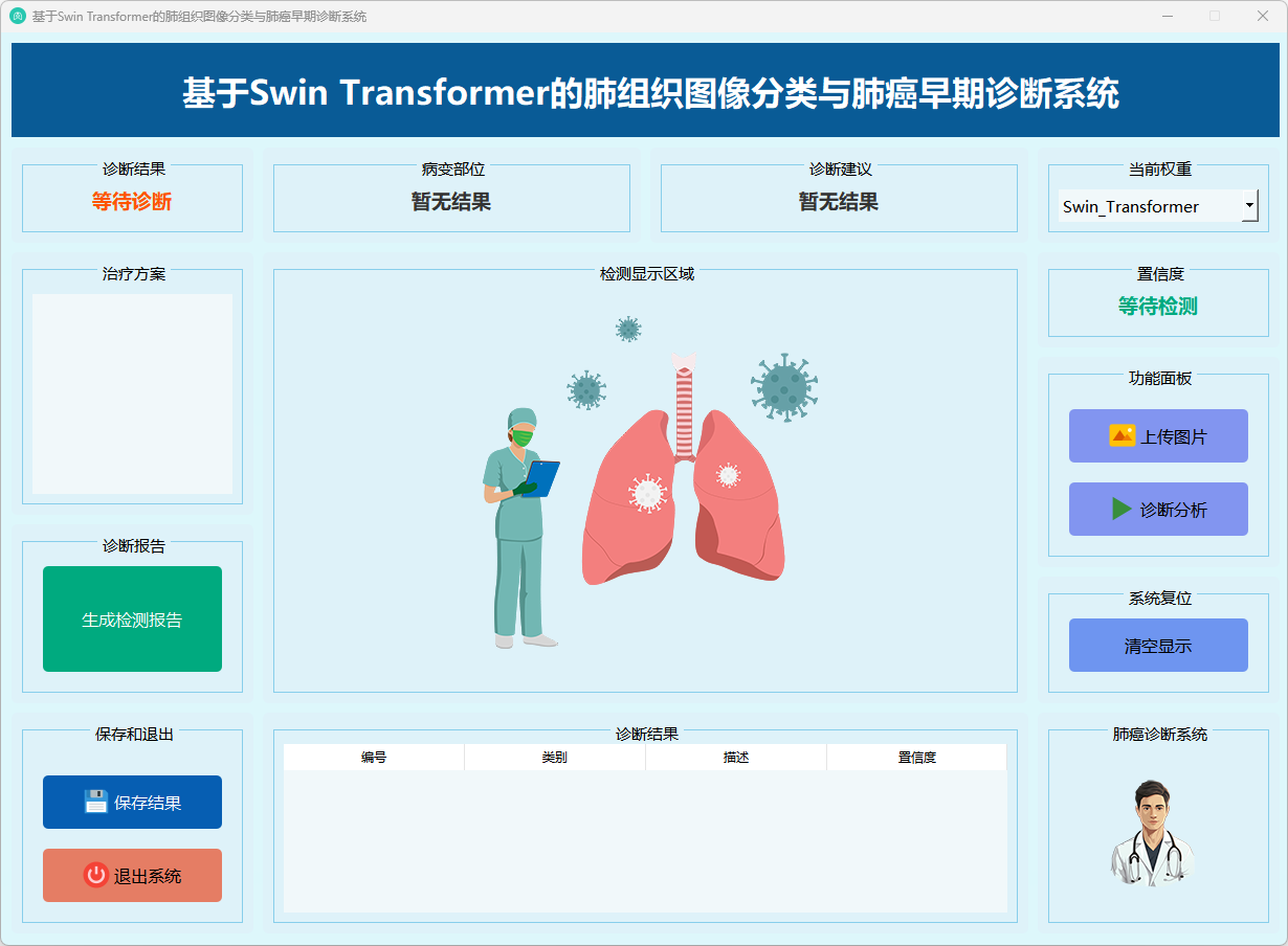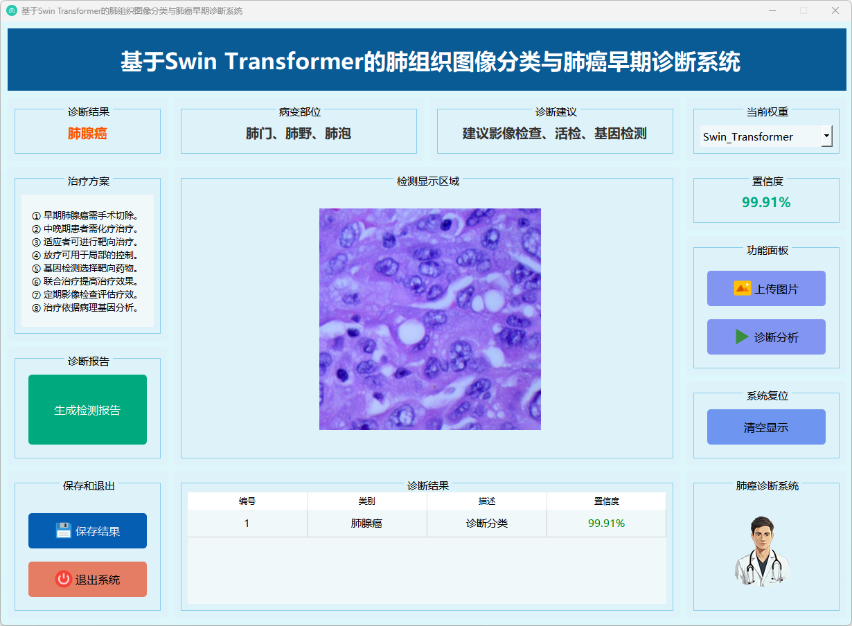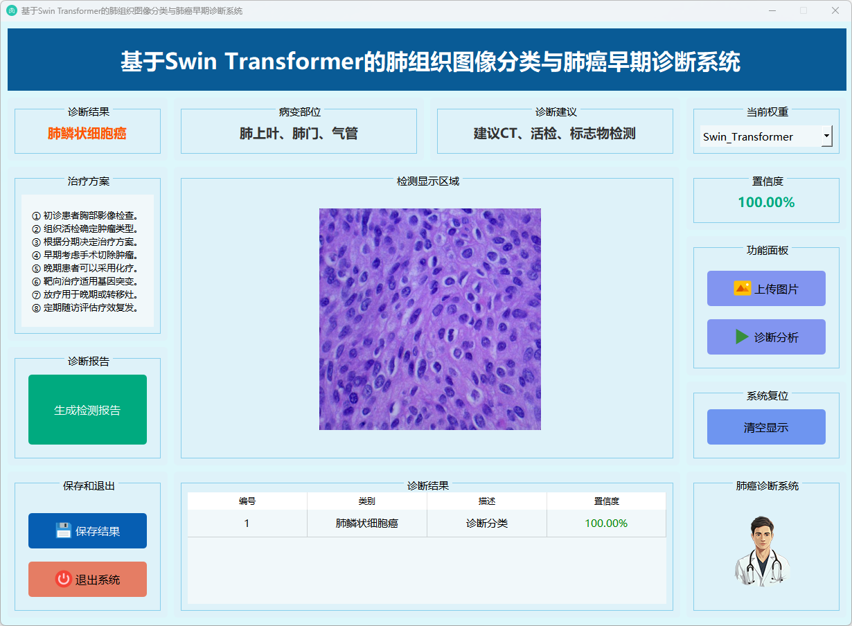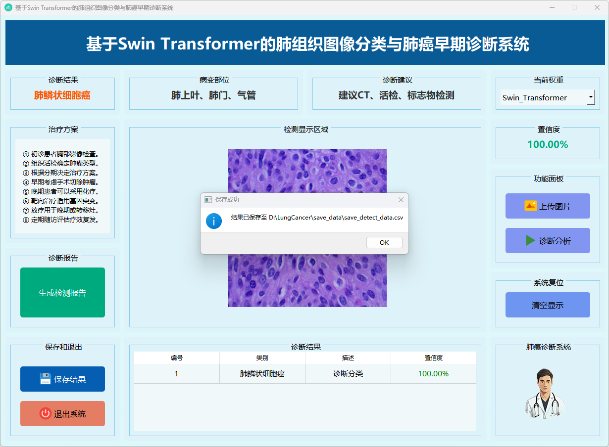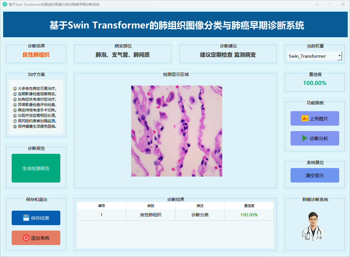 本系统基于Swin Transformer模型,实现肺组织与肺癌的自动分类与诊断,集成特征提取、分类推理与结果可视化,为肺癌智能诊断和临床辅助提供支持。