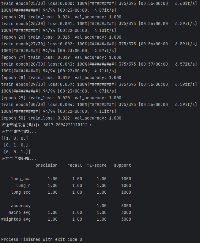 混淆矩阵图显示,模型在所有类别上的预测均为 1.0,对角线元素无误,表明每个类别的预测完全准确。肺腺癌、良性肺组织和肺鳞状细胞癌的样本都被正确分类,进一步证明了模型的高精度和鲁棒性,几乎没有分类错误。