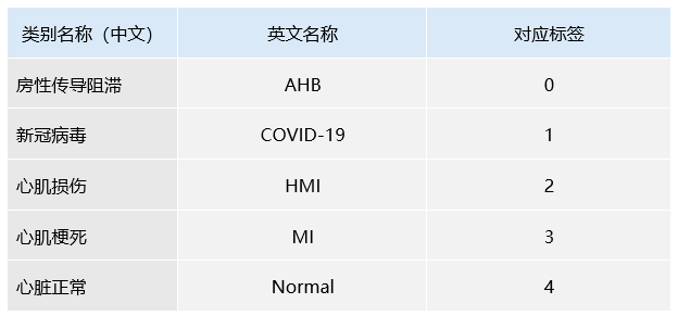 (2)数据结构:包含训练集与测试集,分为五类样本(房性传导阻滞、新冠病毒、心肌损伤、心肌梗死、心脏正常)。