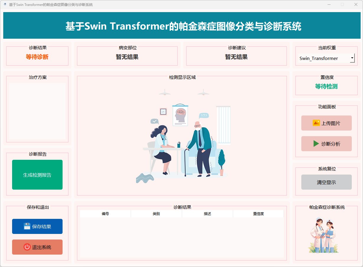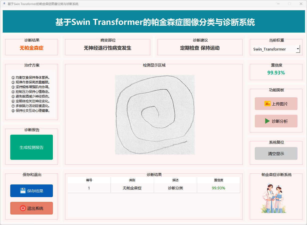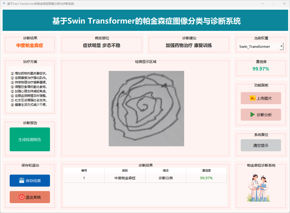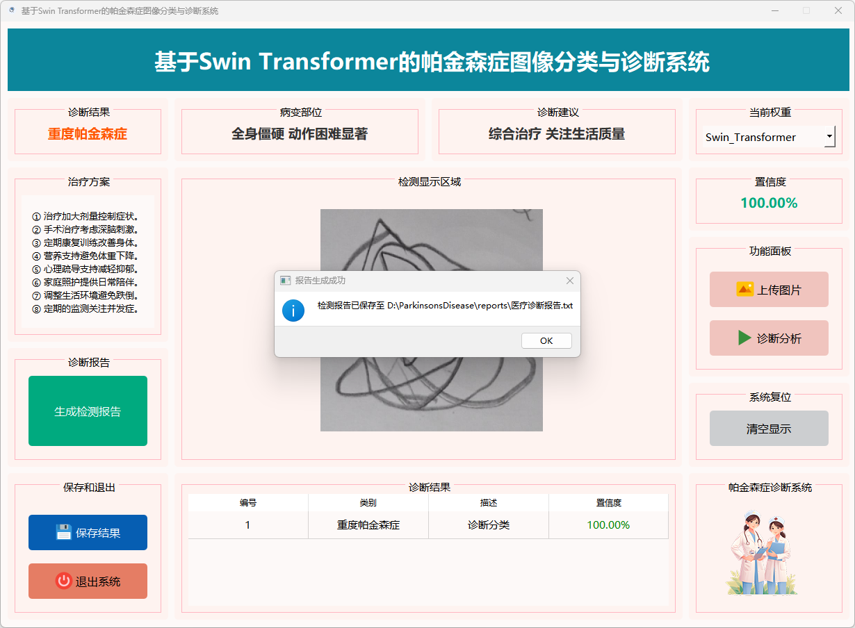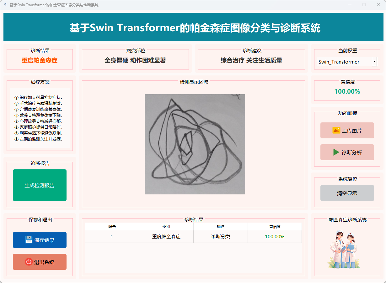 本系统基于Swin Transformer实现帕金森症不同阶段的手绘图案自动化诊断,涵盖健康、轻度、中度和重度四个阶段。通过“数据输入—模型推理—结果展示”流程,实现病变阶段精准识别,提升诊断效率。
