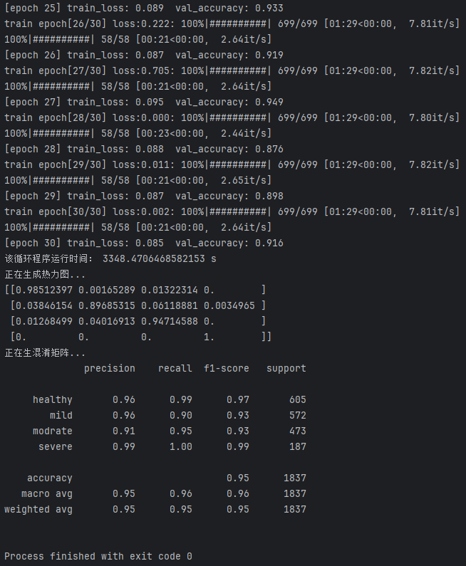 从这张混淆矩阵热力图可以看出,模型在分类任务中表现优异。健康类别的预测准确率为99%,轻度和严重病症的分类准确度分别为90%和95%。尽管存在少量误分类,尤其是轻度与健康、轻度与严重之间的混淆,但模型在严重病症识别上几乎完美。整体而言,模型表现出较强的准确性和良好的泛化能力。
