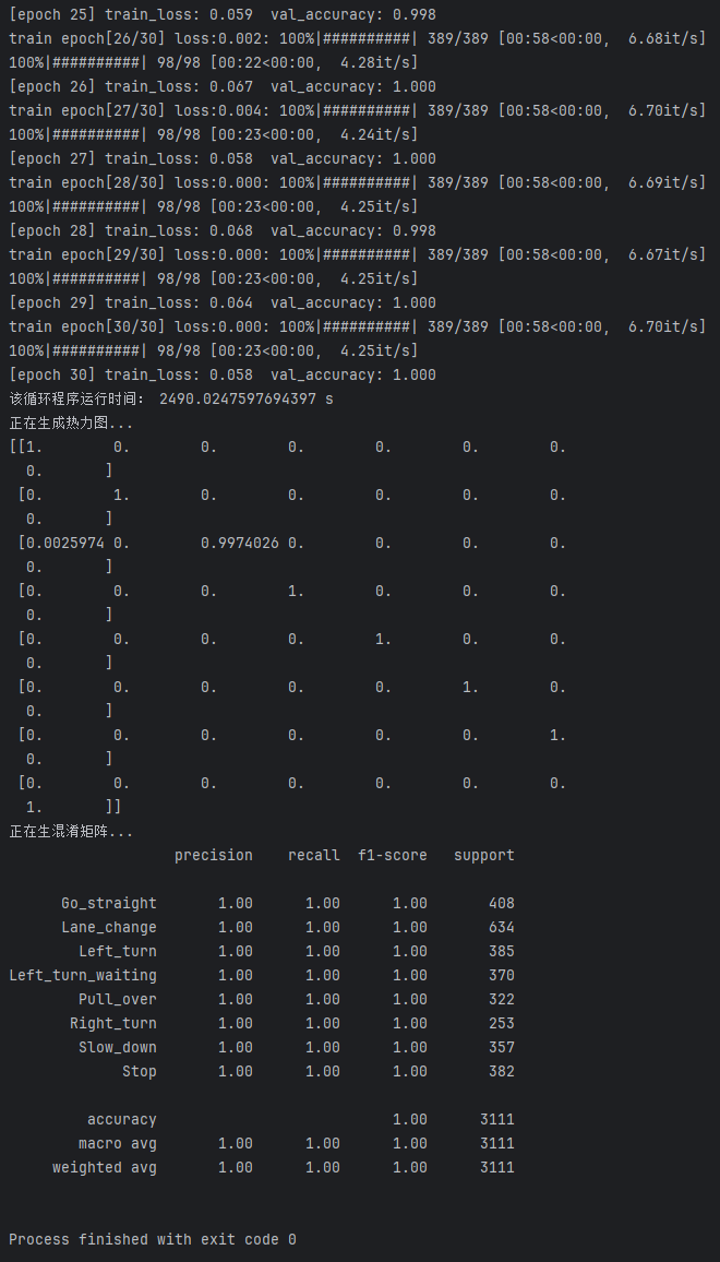 混淆矩阵显示所有类别的对角线值为1.00,表明每个手势指令(如直行、变道、左转弯等)都被准确分类。非对角线值为0,说明没有误分类,模型能够完美区分各手势指令。