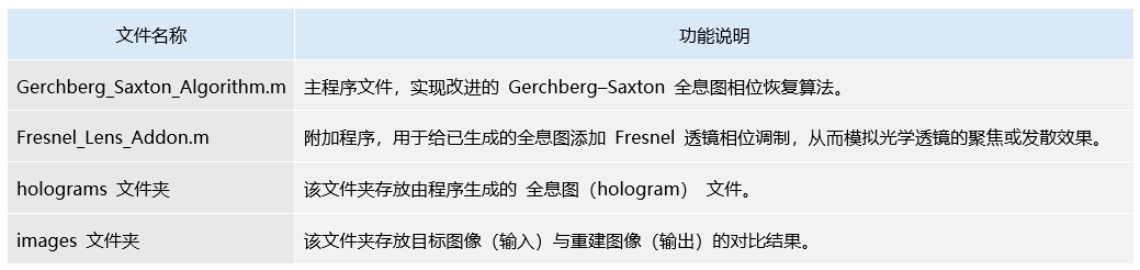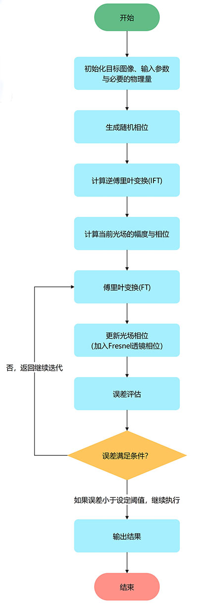 本系统采用改进的Gerchberg–Saxton算法结合Fresnel透镜相位调制,实现全息图的相位恢复与重建,以提升重建图像的精度与光学一致性。