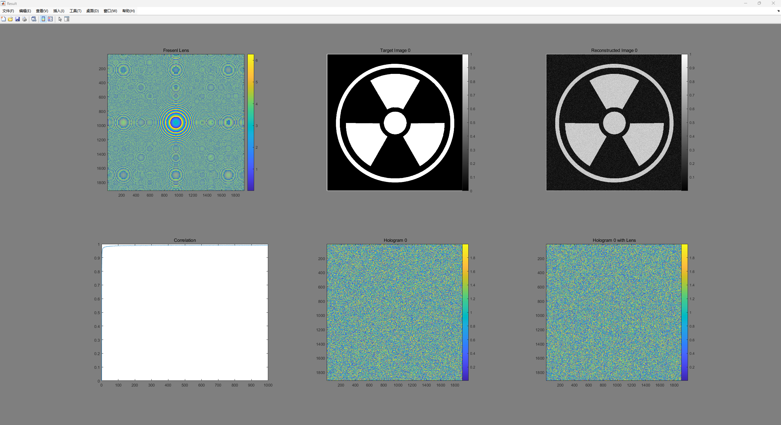 此图展示了通过改进的Gerchberg-Saxton算法和Fresnel透镜相位调制生成的全息图及重建图像。通过引入透镜的相位调制,算法优化了全息图的生成过程,使得最终的图像更加精确。相关性图也表明,该改进方法能够有效地提升重建图像的质量。