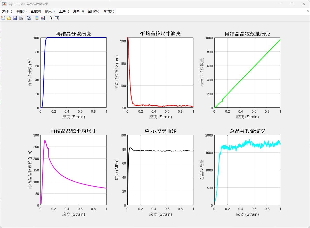 图1 动态再结晶(DRX)数值模拟结果:再结晶分数、晶粒尺寸、晶粒数量与应力-应变演化