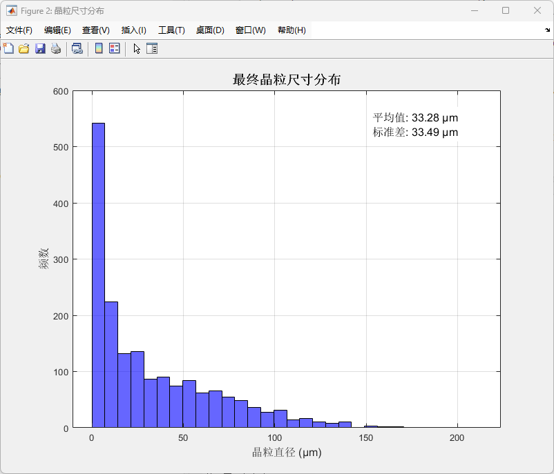 分析:最终晶粒直径分布直方图。晶粒尺寸呈明显右偏分布,算术平均粒径为 33.28 μm,标准差为 33.49 μm。