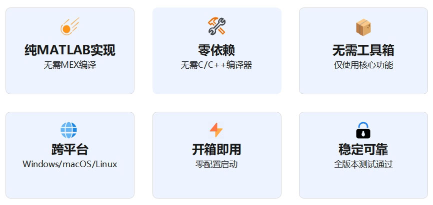 纯MATLAB实现,支持R2020b及以上所有版本,无需编译器和工具箱,跨平台开箱即用。