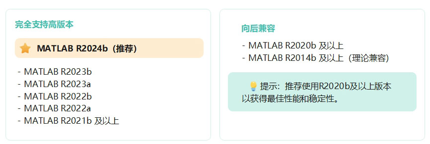 支持MATLAB R2020b及以上所有版本,推荐使用R2024b,理论兼容R2014b及以上版本。