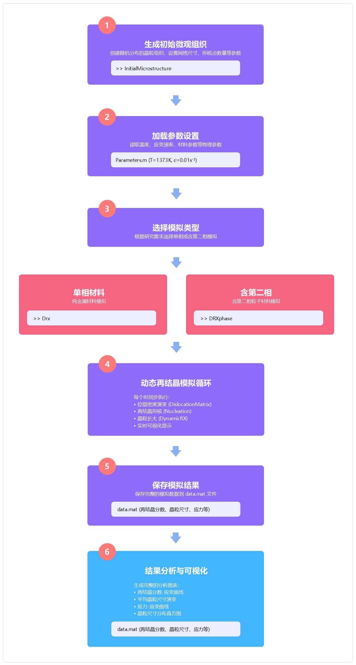 本指南介绍如何使用 MATLAB 进行动态再结晶(DRX)元胞自动机模拟,包括初始组织生成、模拟运行和结果分析三个步骤。