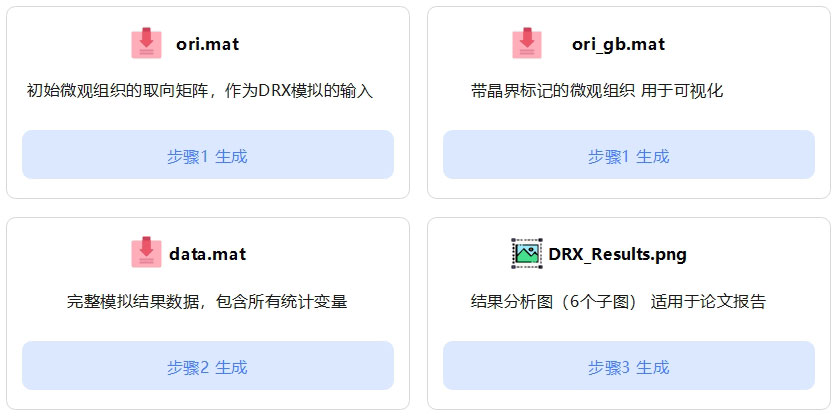 运行 analyze_results 脚本自动生成包含再结晶分数、晶粒尺寸演变等六项统计数据的可视化图表(DRX_Results.png)。