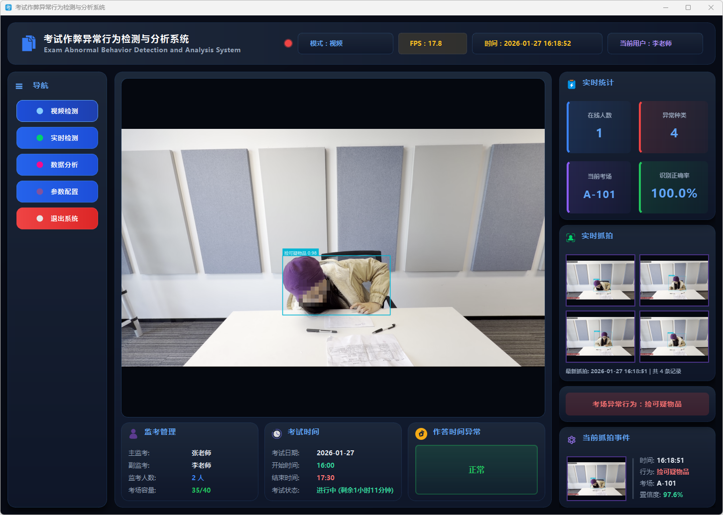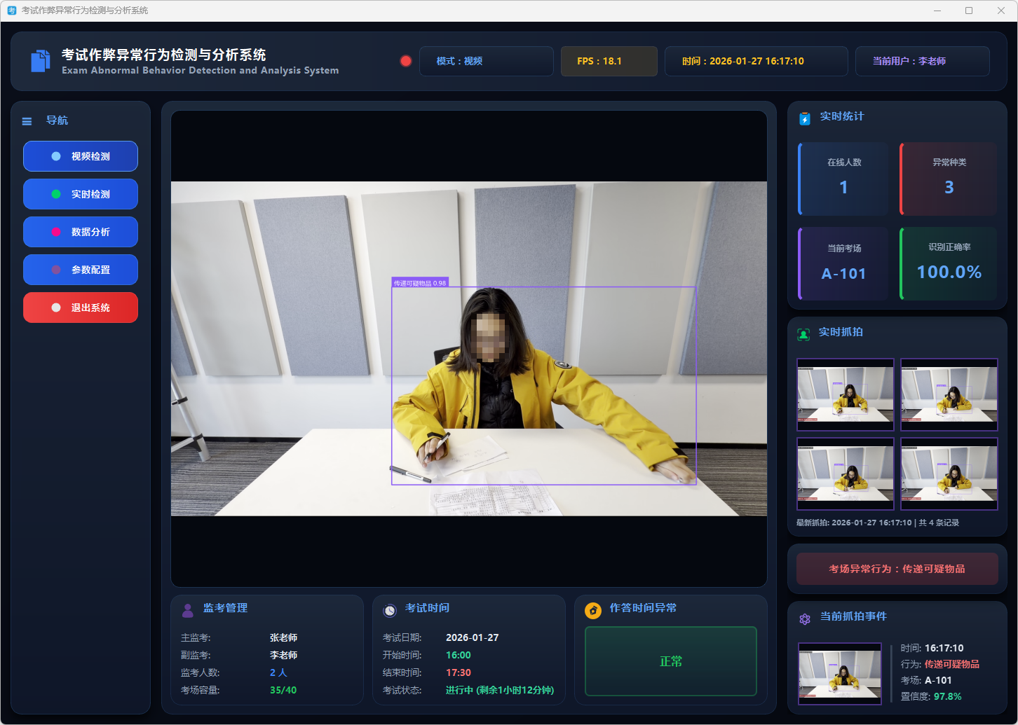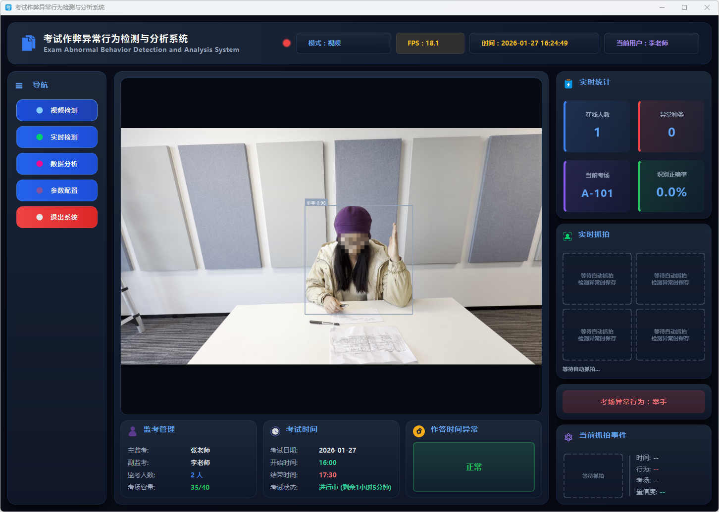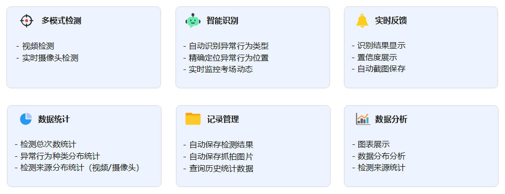 本系统提供视频检测、实时检测、数据分析、参数配置四大核心功能,实现考试异常行为的智能识别、实时监控、数据统计与可视化分析。