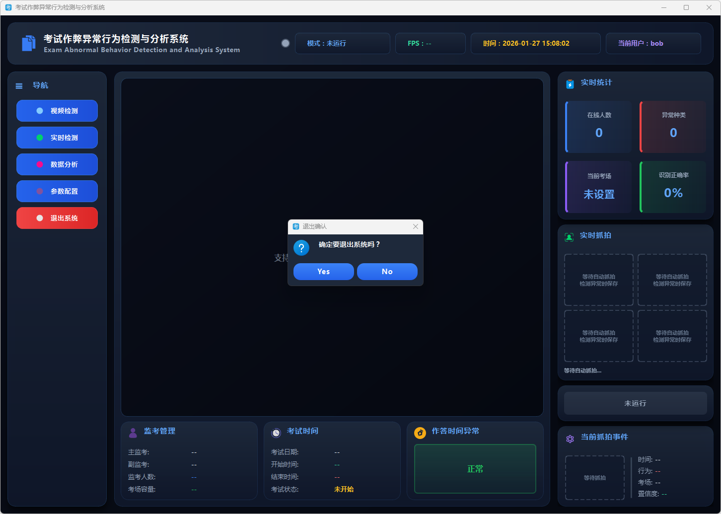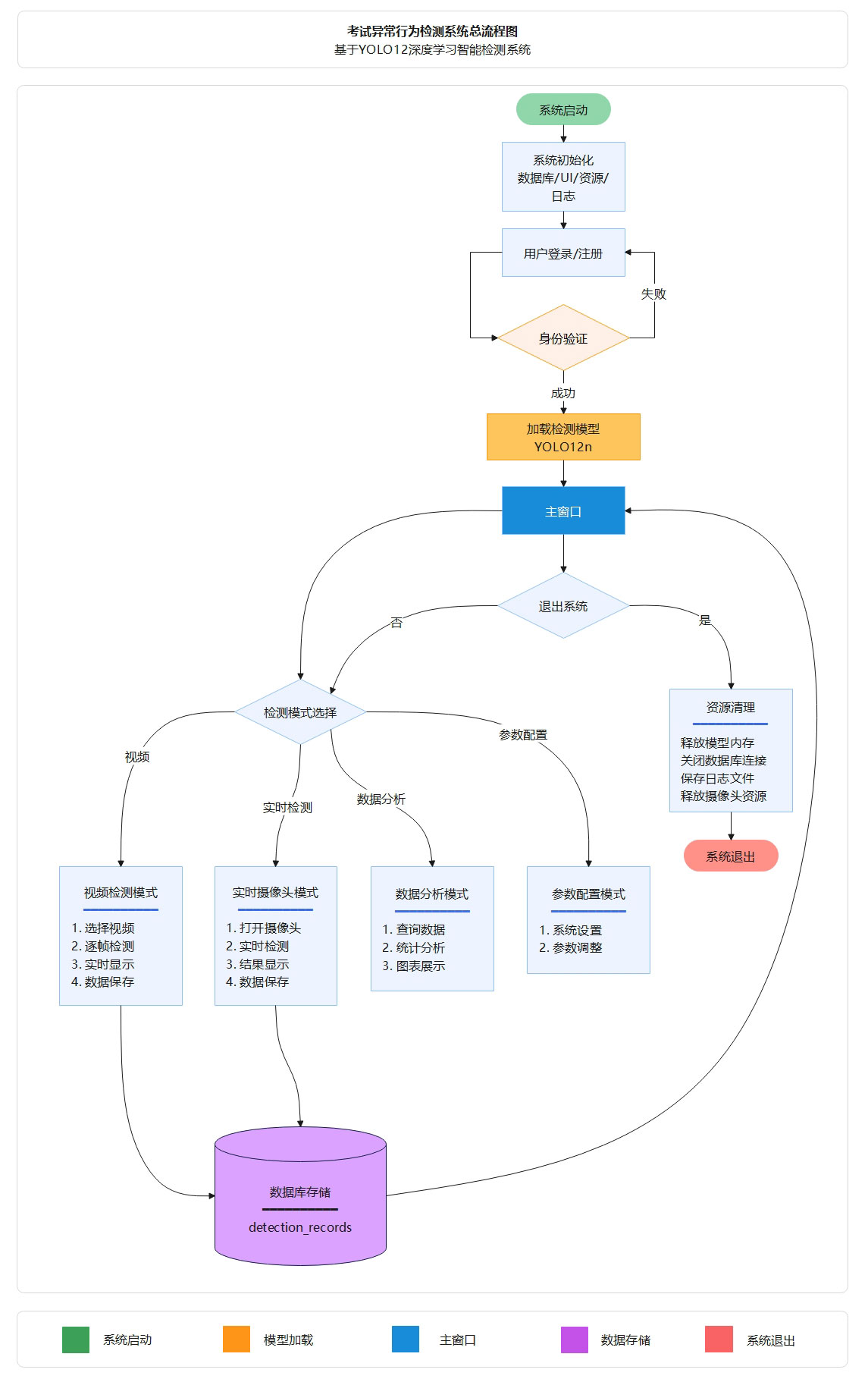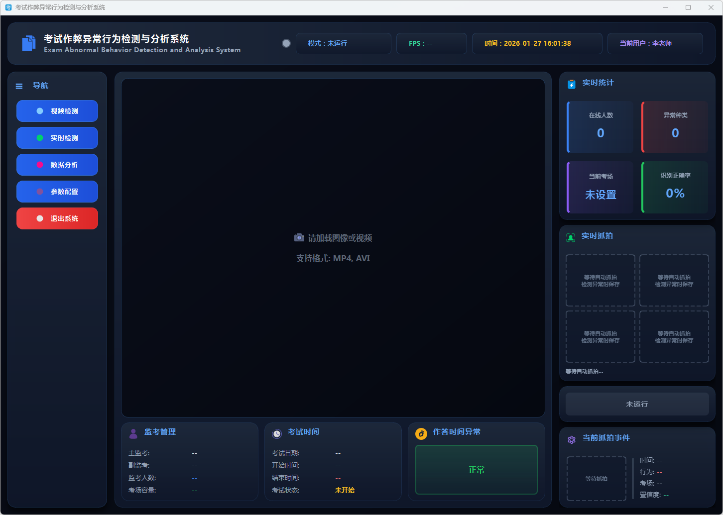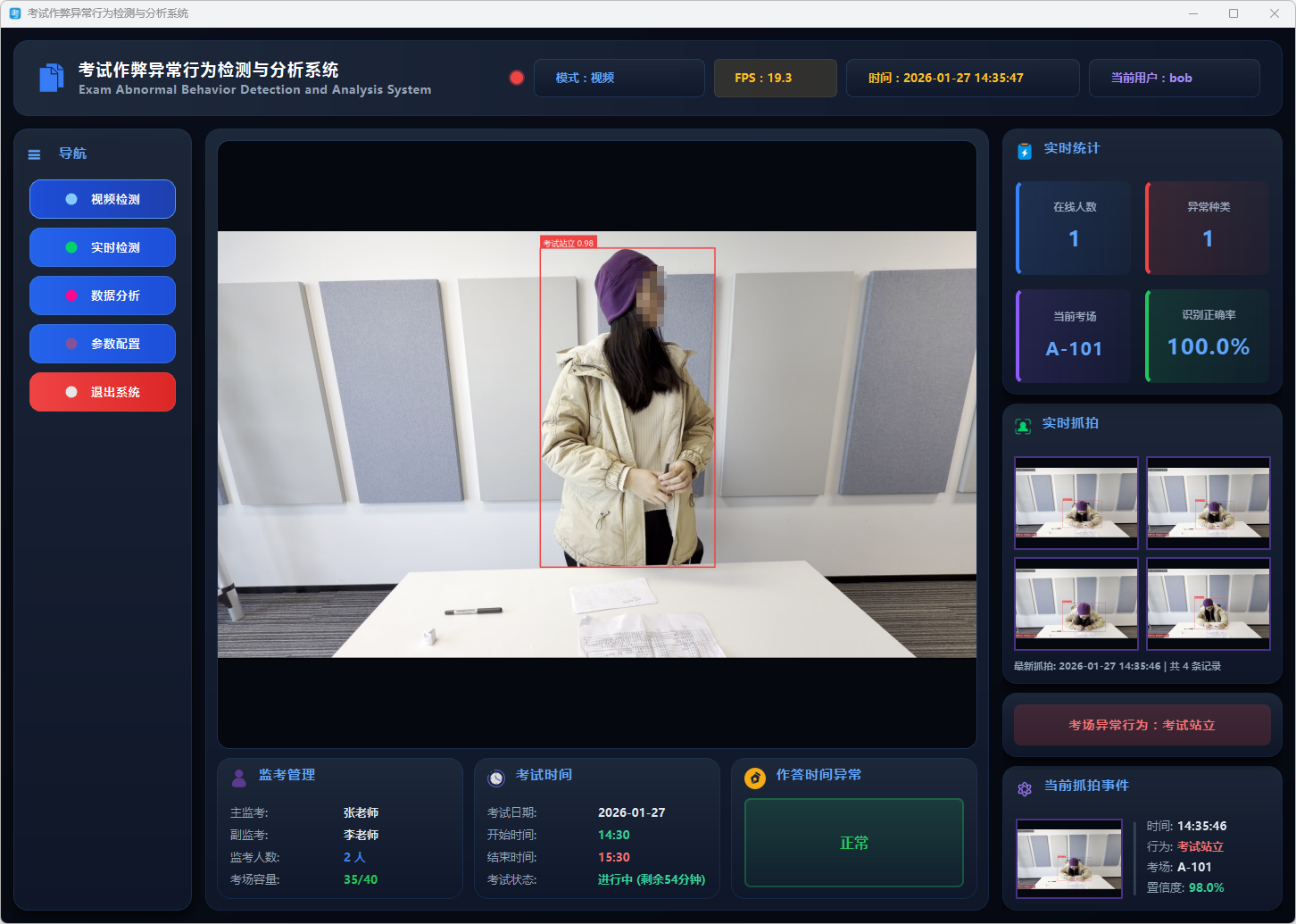 本系统提供视频检测、实时检测、数据分析、参数配置四大核心功能,实现考试异常行为的智能识别、实时监控、数据统计与可视化分析。
