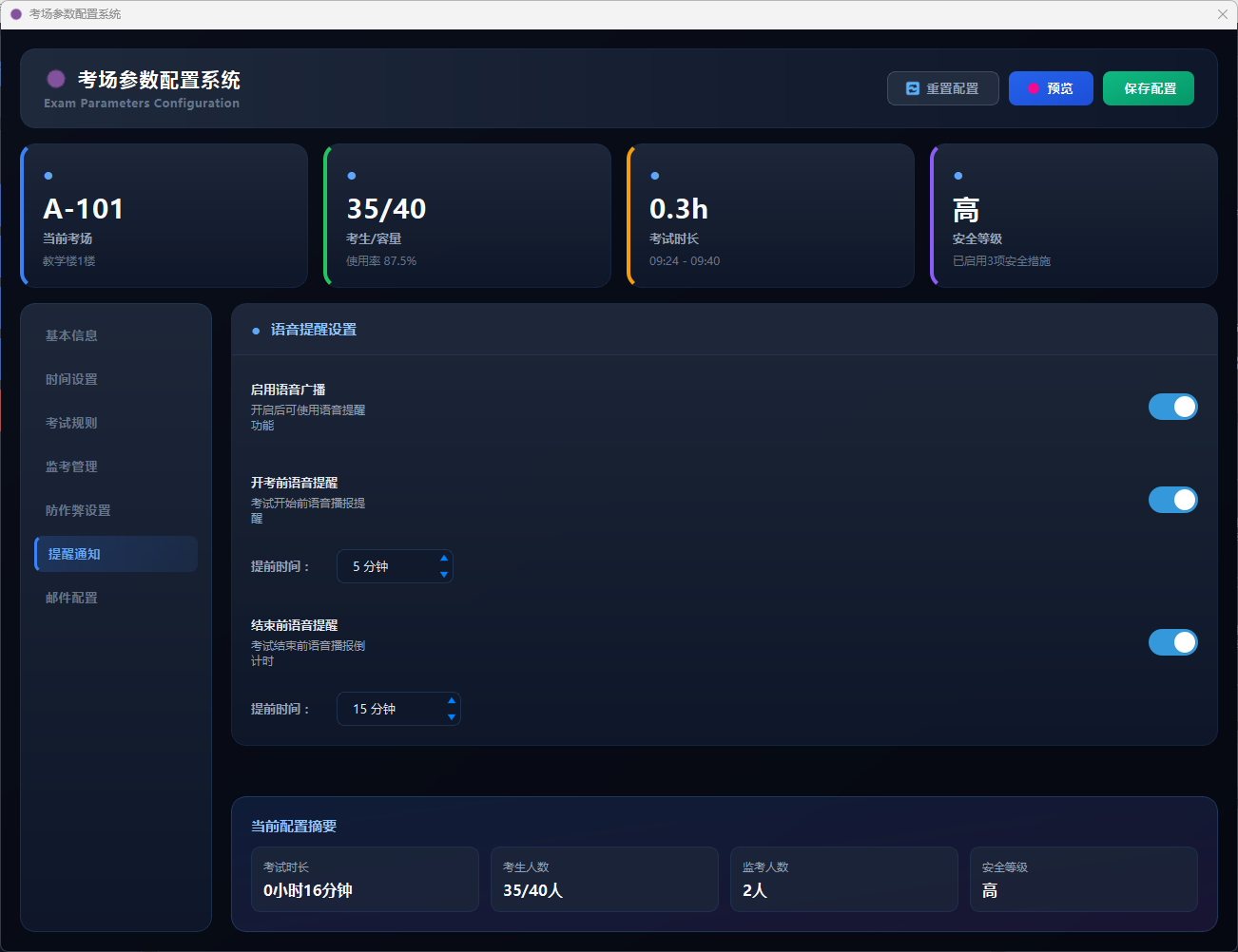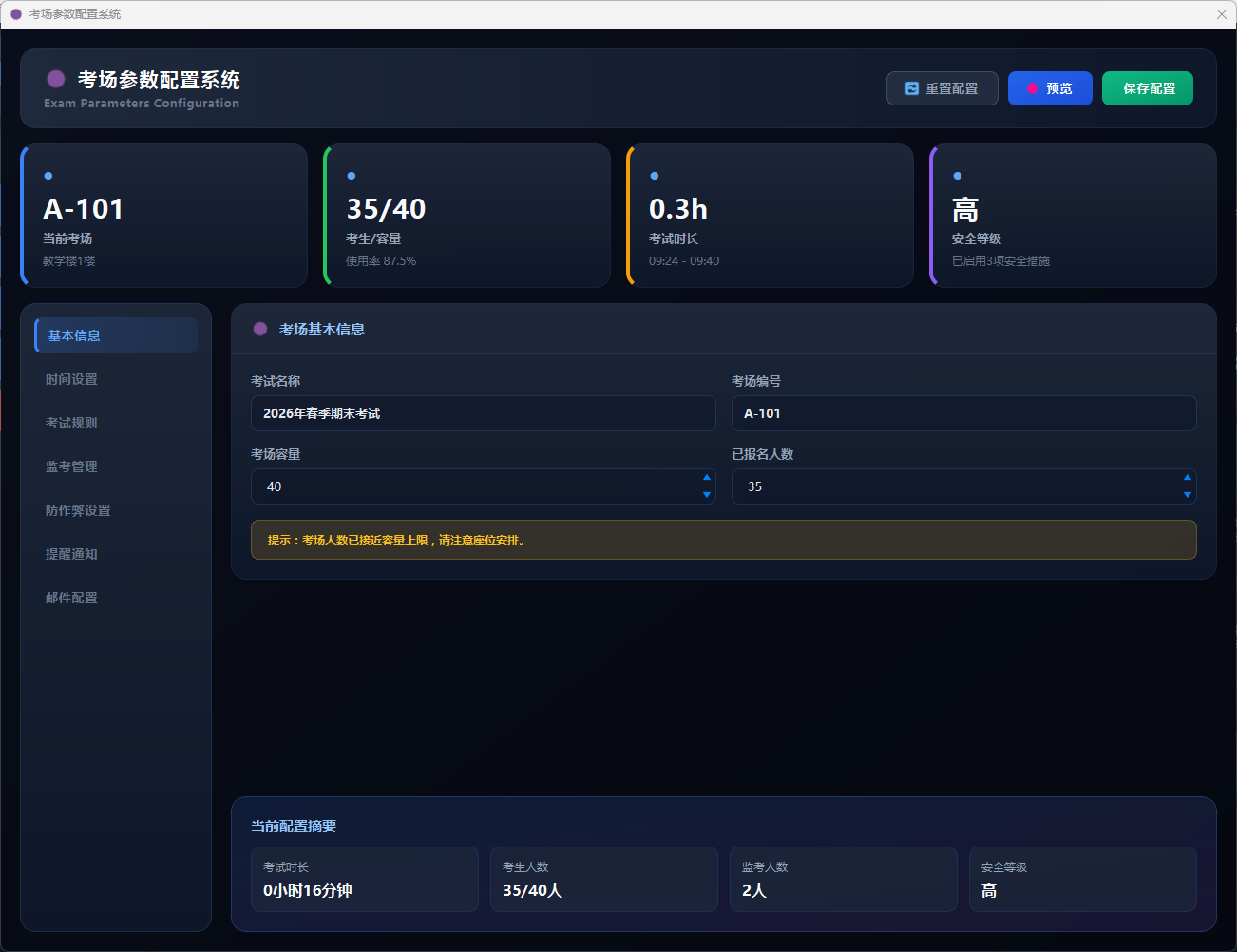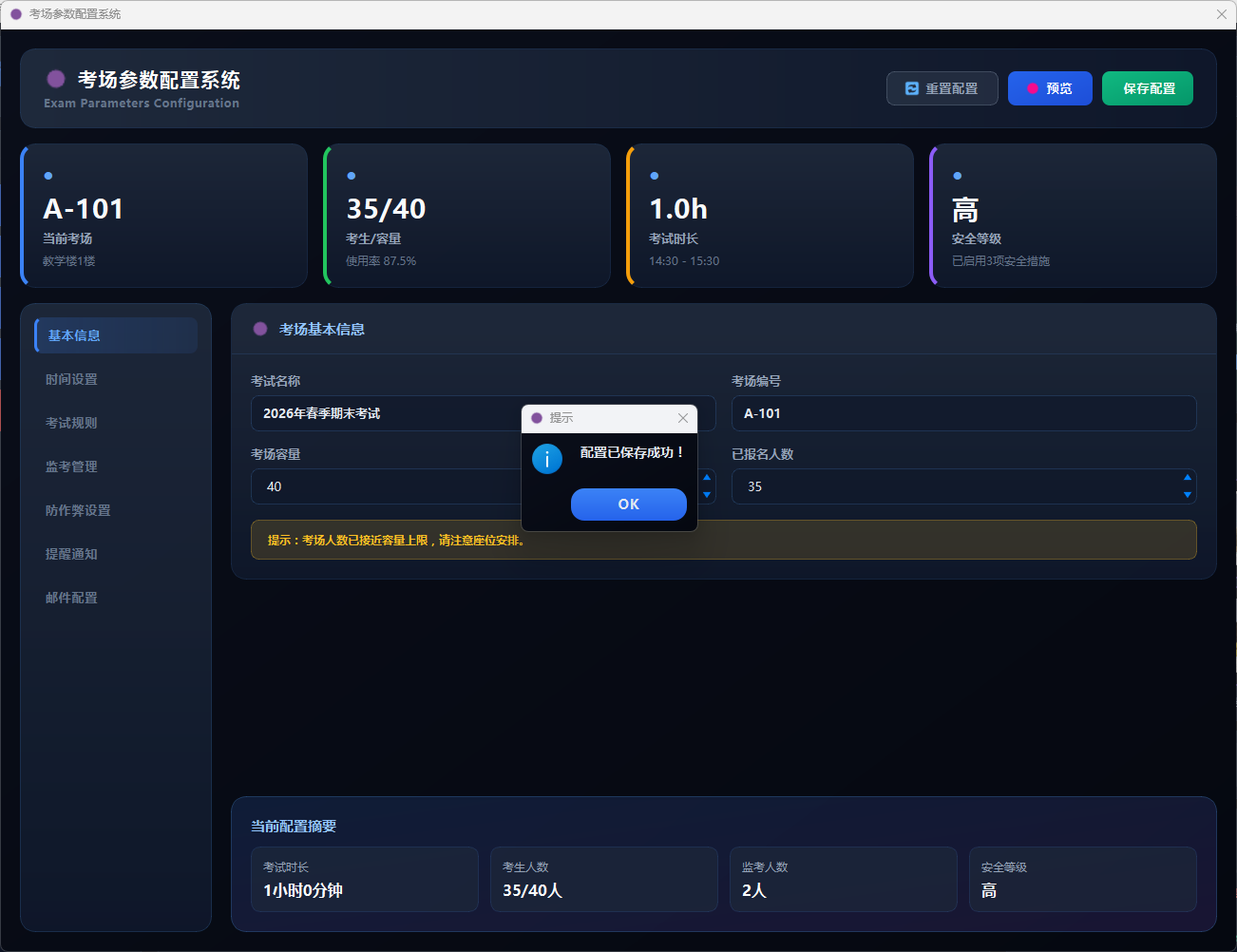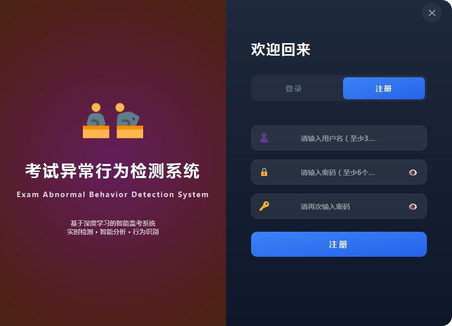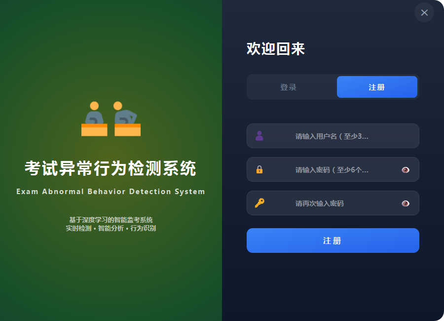 本系统提供视频检测、实时检测、数据分析、参数配置四大核心功能,实现考试异常行为的智能识别、实时监控、数据统计与可视化分析。