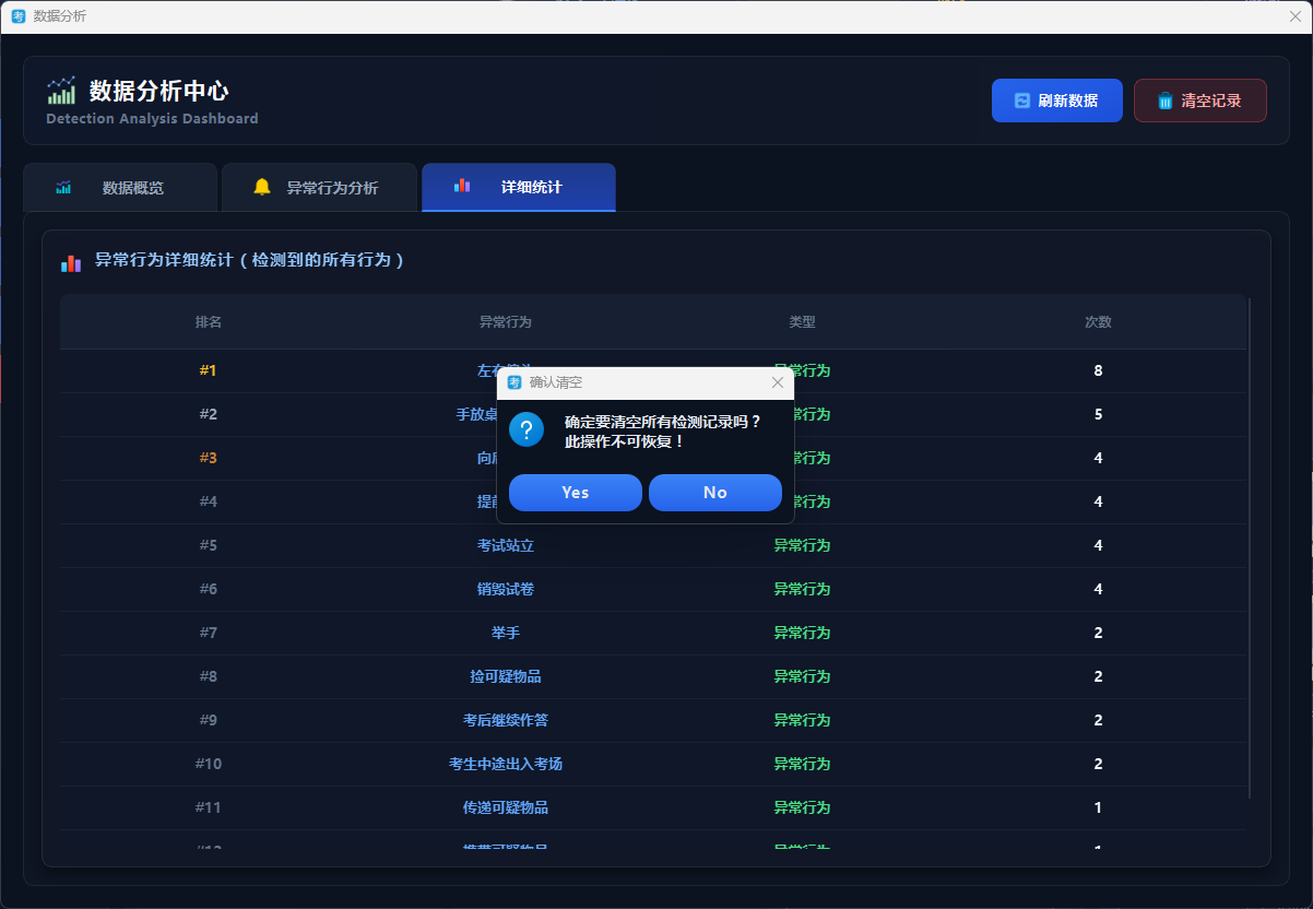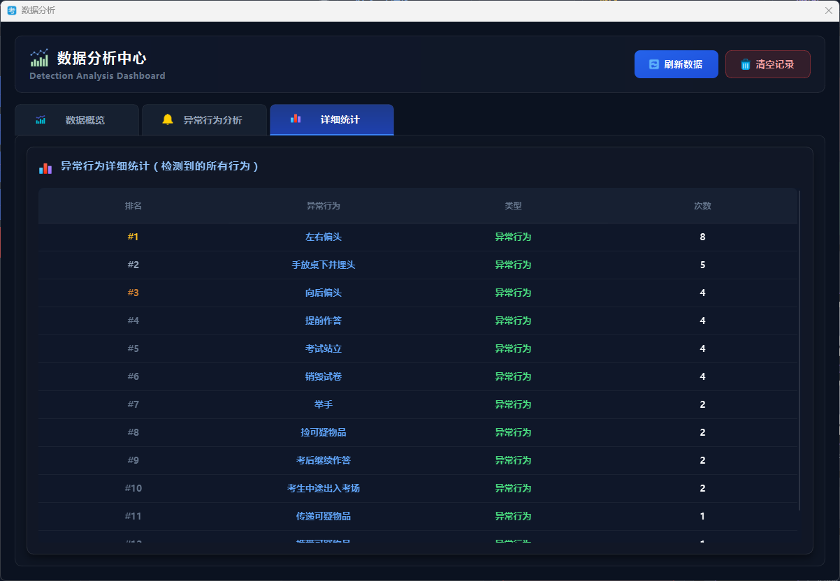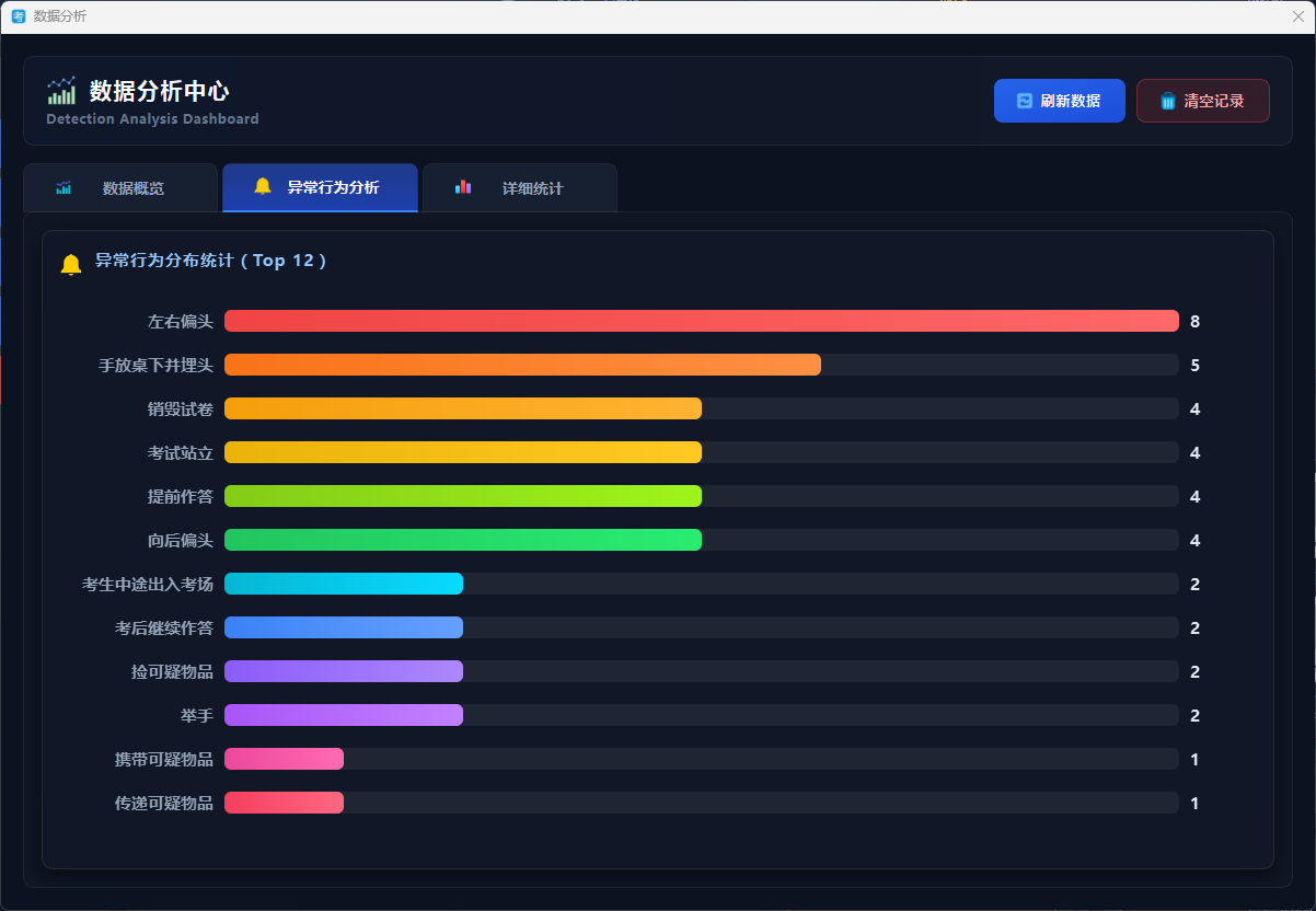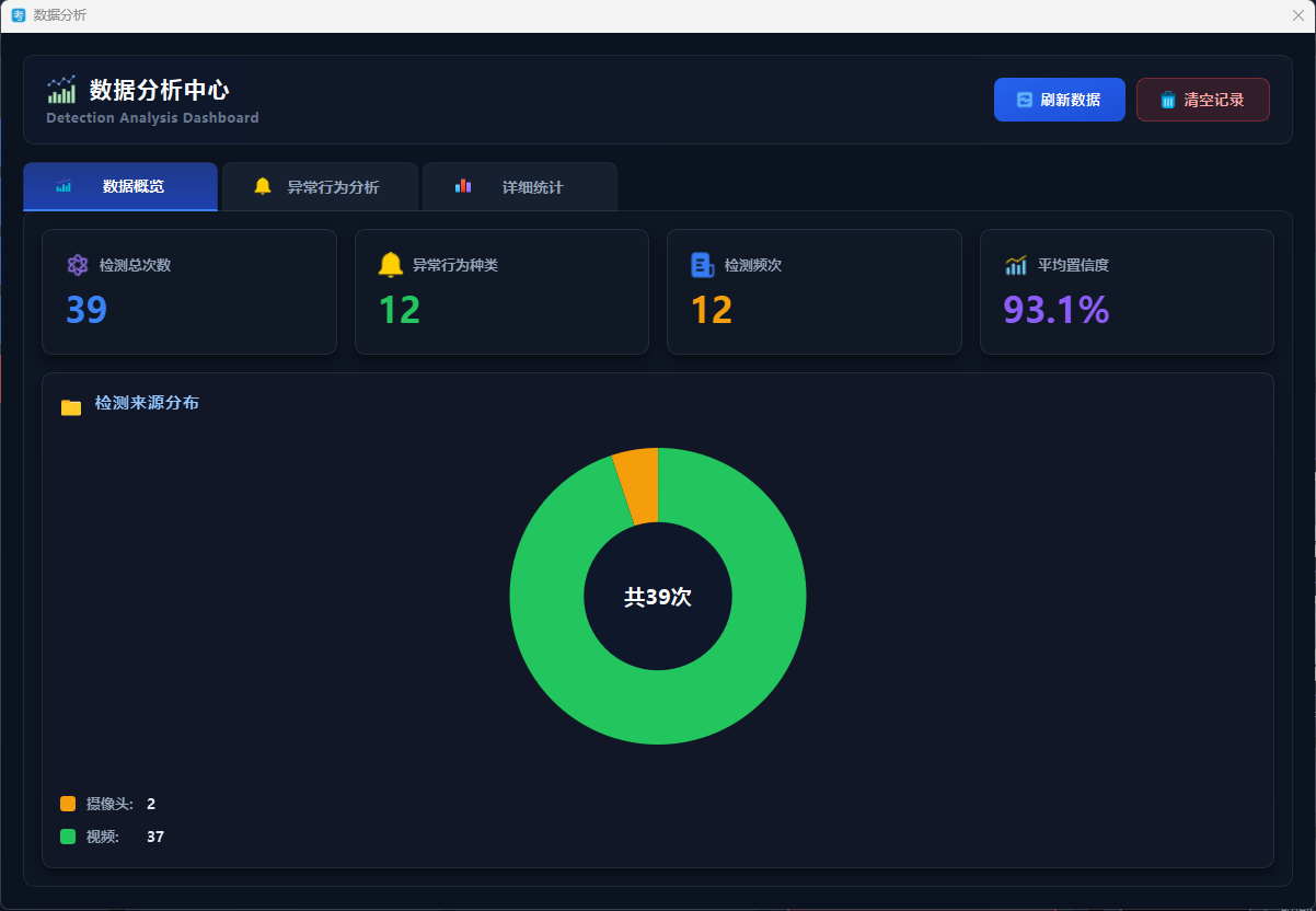 数据分析模块提供识别数据的可视化展示和统计分析功能,用户点击”数据分析”按钮打开独立的分析窗口,可查看检测总次数、异常行为种类、检测频次、平均置信度等关键指标,通过条形图、饼图、统计卡片等形式直观展示数据分布,包含数据概览、异常行为分析、详细统计三个标签页,支持查询历史识别记录(存储在 SQLite数据库)、查看检测来源分布(视频/摄像头)、异常行为类型分布统计(Top12)、清空当前用户记录等操作,实现识别数据的持久化存储和全面分析。