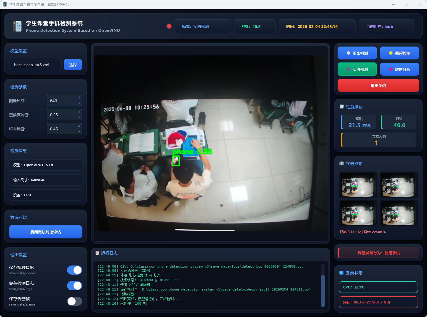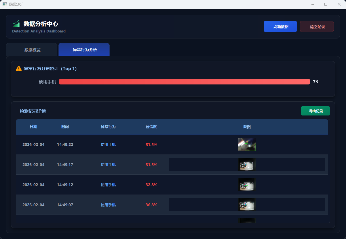 实时检测模式支持连接本地或网络摄像头进行手机使用行为识别。系统自动扫描可用摄像头,用户选择后对实时视频流进行检测(支持 GPU 加速),并实时显示识别结果与置信度。当检测到手机使用行为时,系统自动告警并抓拍保存图片,同时实时更新统计信息,所有检测结果自动存入数据库。