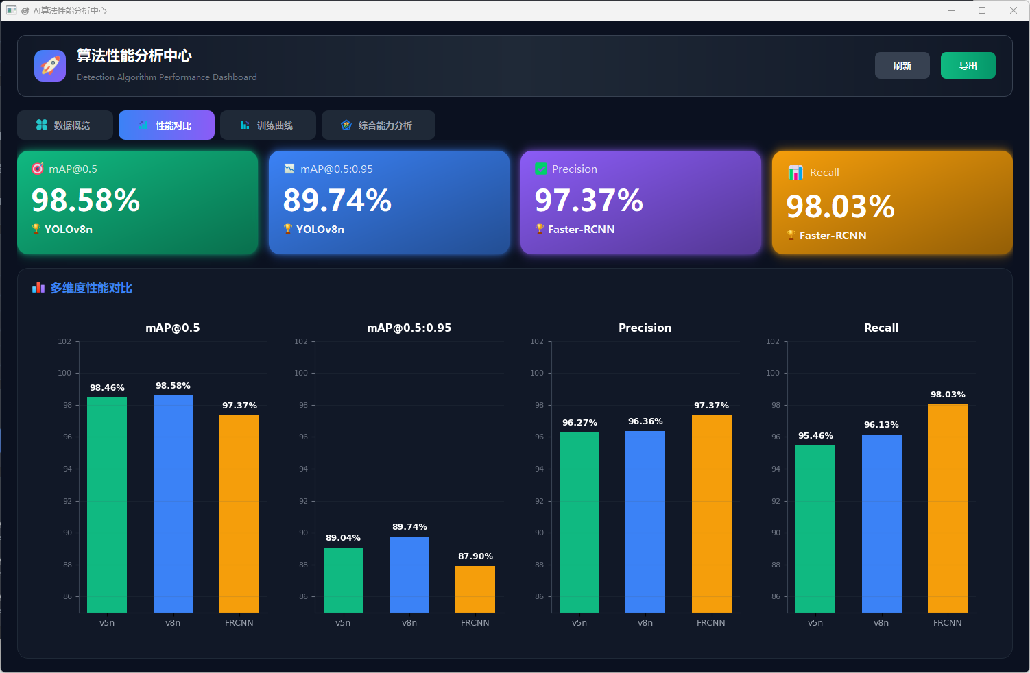 本系统采用 Python 3.12 开发,基于 YOLOv5 深度学习框架实现目标检测,使用 PyQt5 构建图形用户界面,结合 OpenCV 进行图像与视频处理,并通过多线程异步机制保障界面运行的流畅性。系统采用 SQLite 数据库实现识别数据的持久化存储与查询,整体架构清晰、模块化设计良好,便于后续功能扩展与维护。