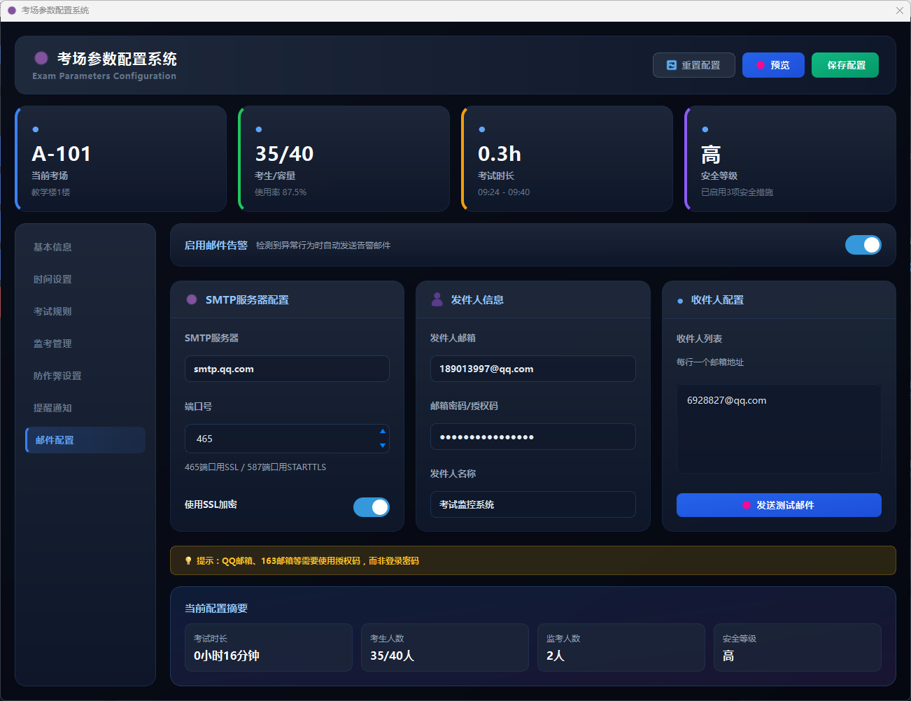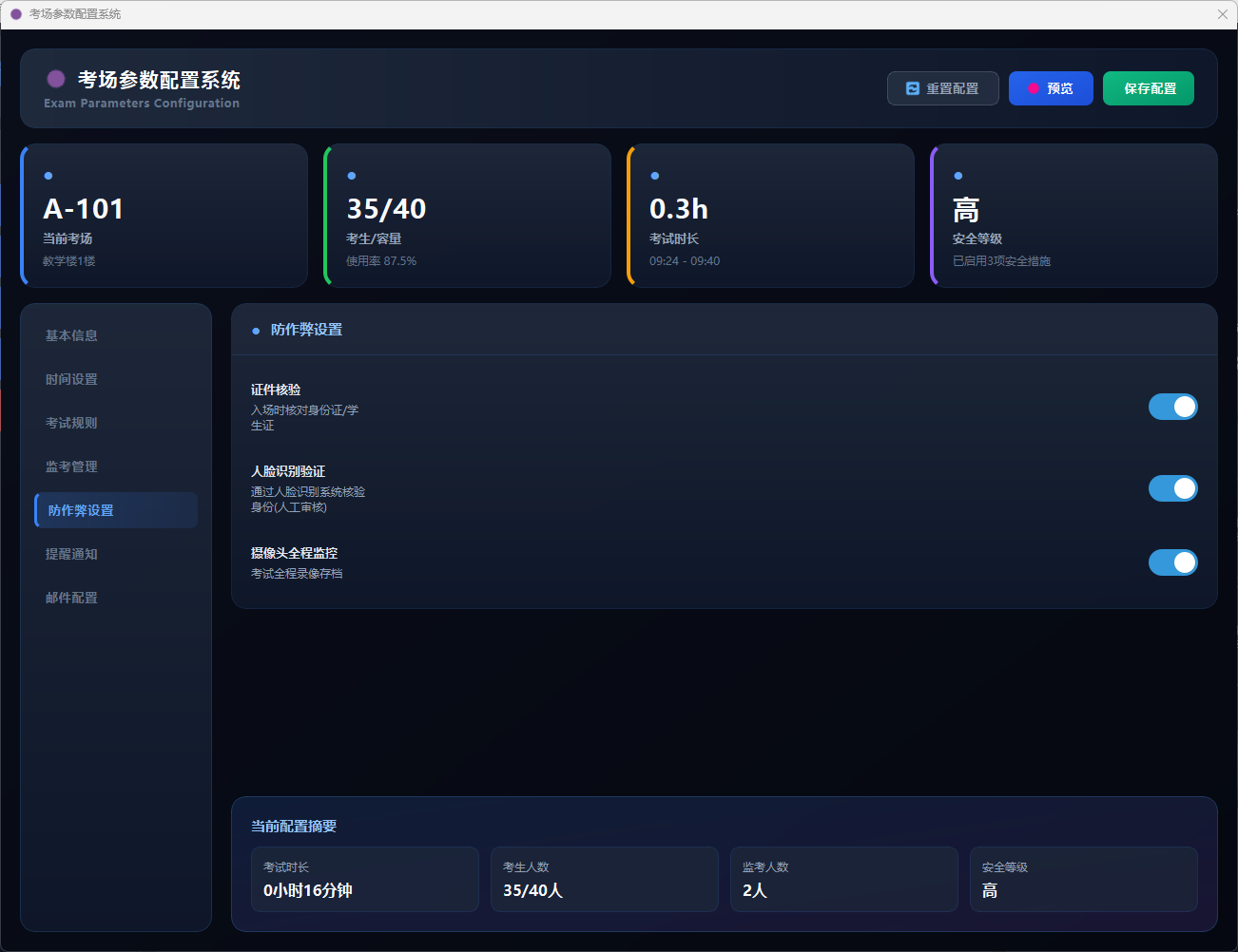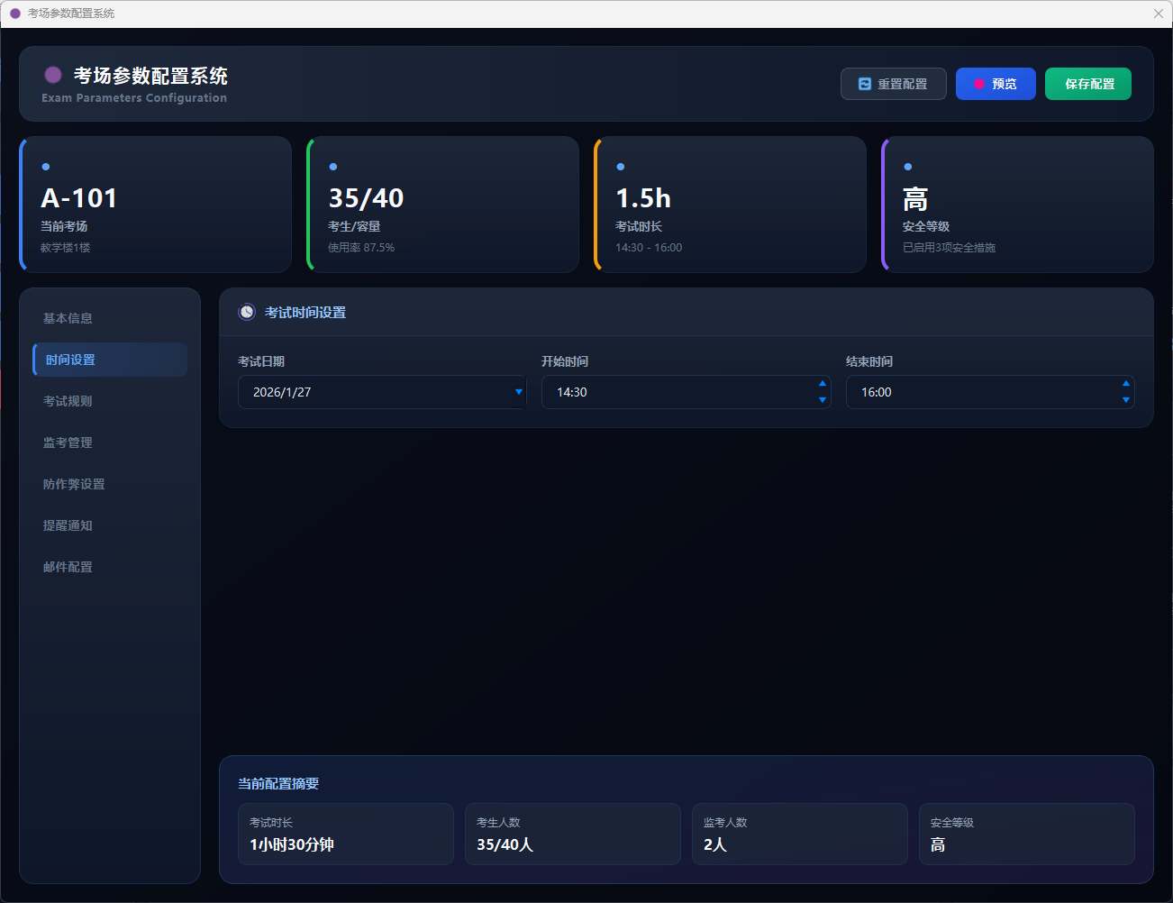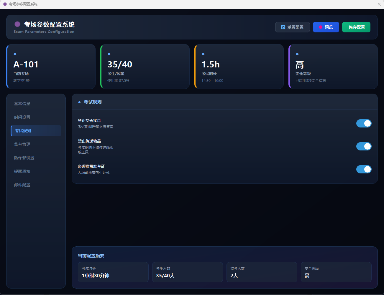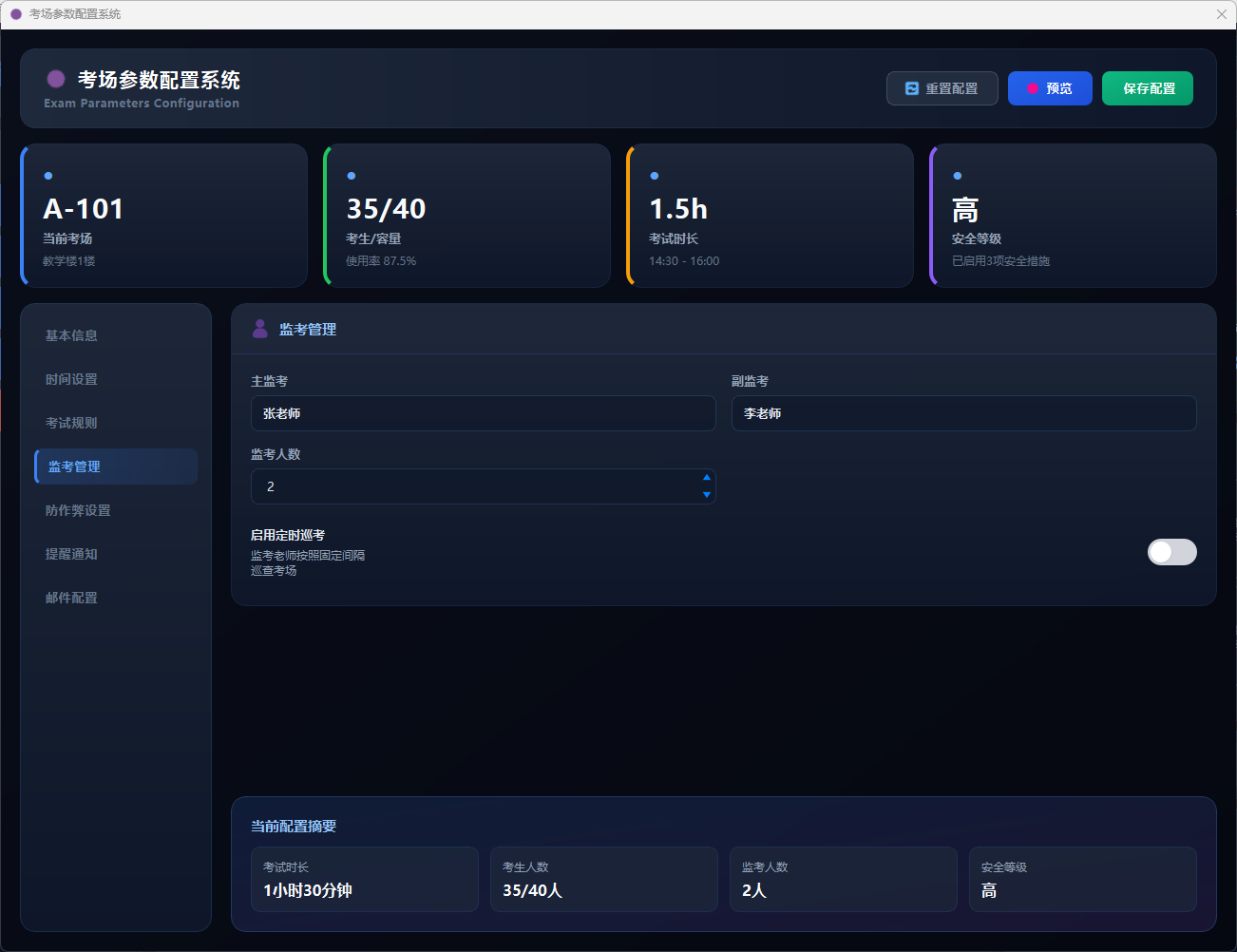 在系统实现方面,基于 PySide6 框架开发了可视化图形用户界面,支持视频文件检测、实时摄像头检测和静态图片检测等多种工作模式,并结合 SQLite 数据库实现检测结果的持久化存储与管理。系统主要功能包括:多源视频输入与处理、实时异常行为检测与标注、考试时间管理与违规检测、考场与监考信息配置、检测结果统计分析以及异常行为检测视频的自动录制与保存。