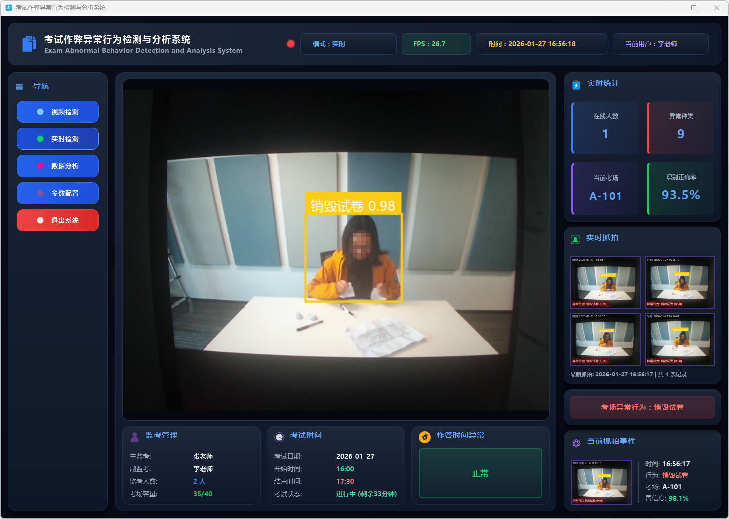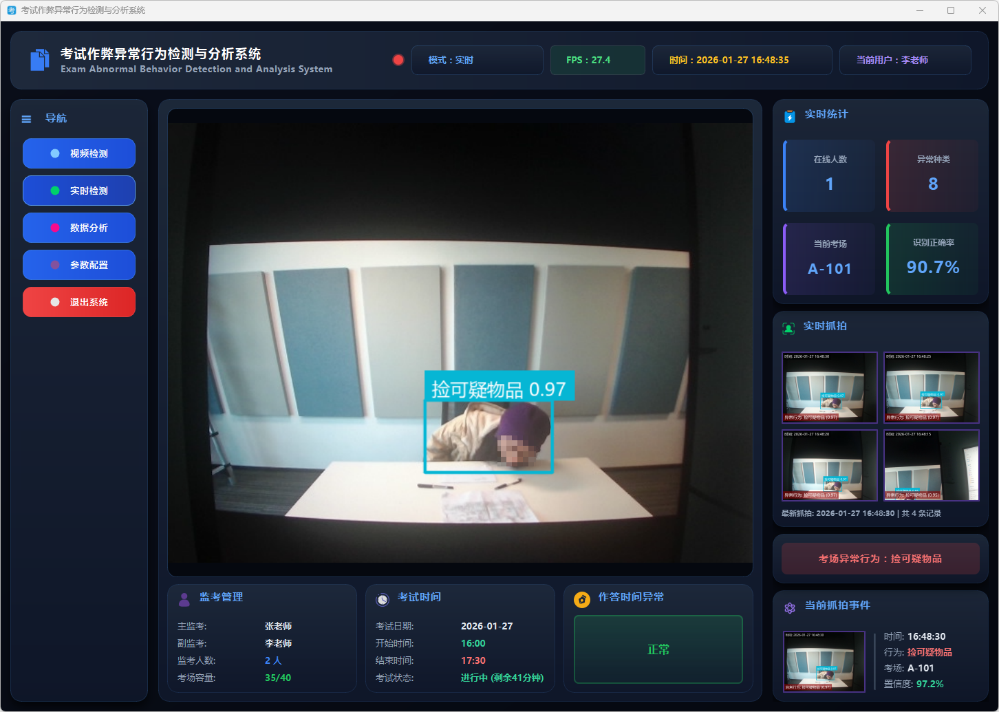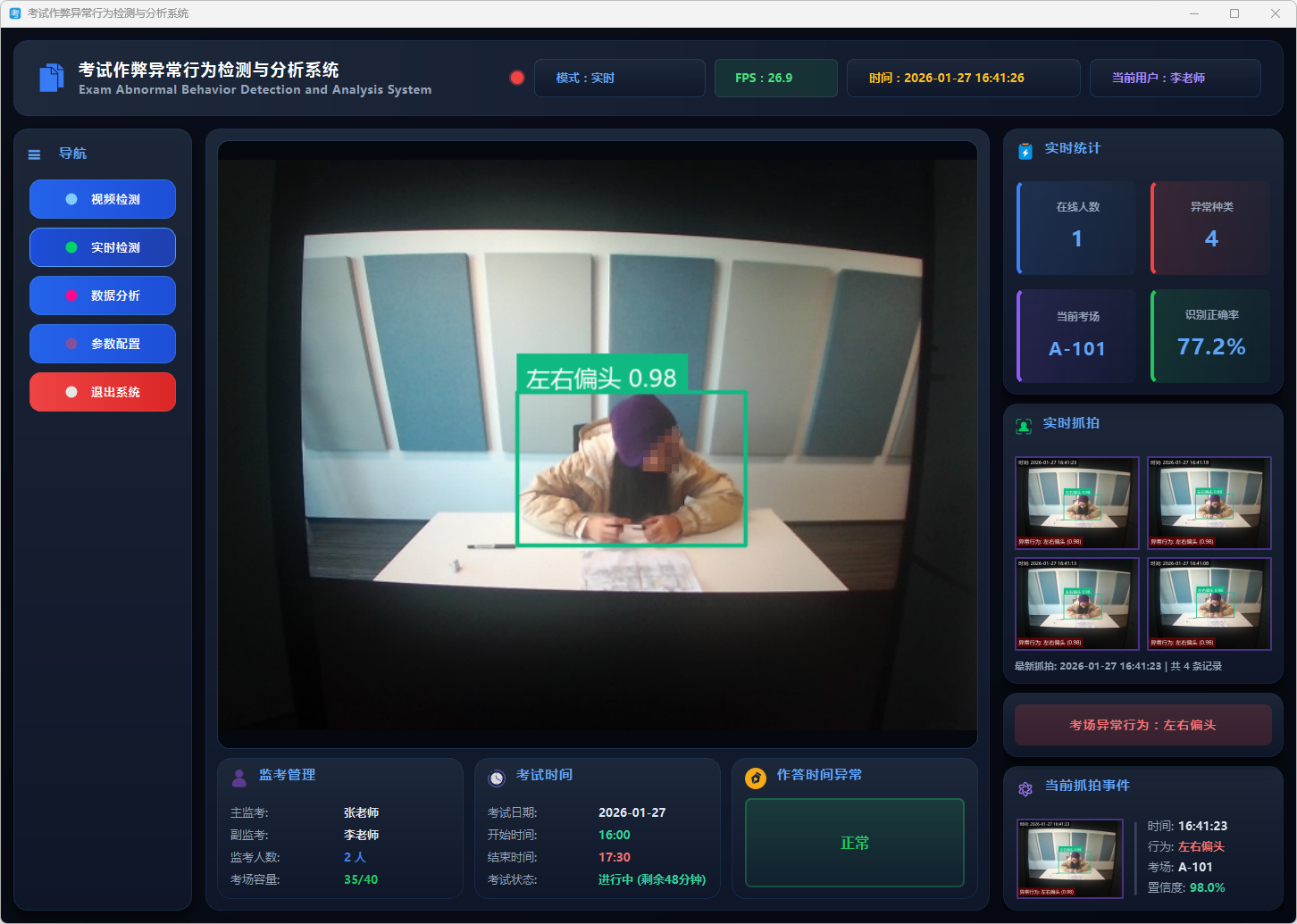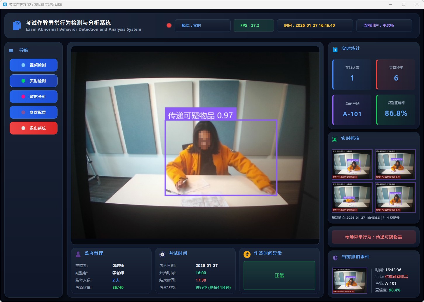 实验与测试结果表明,该系统在实际应用场景下能够较为准确地识别考场中的各类异常行为,检测准确率较高,平均帧率稳定在 30 FPS 以上,系统响应速度能够满足实时监控要求。整体系统界面友好、操作便捷,具有较强的实用性和推广价值,可为考试监考工作提供有效的技术支持,减轻监考人员工作负担,提高考试的公平性与规范性。