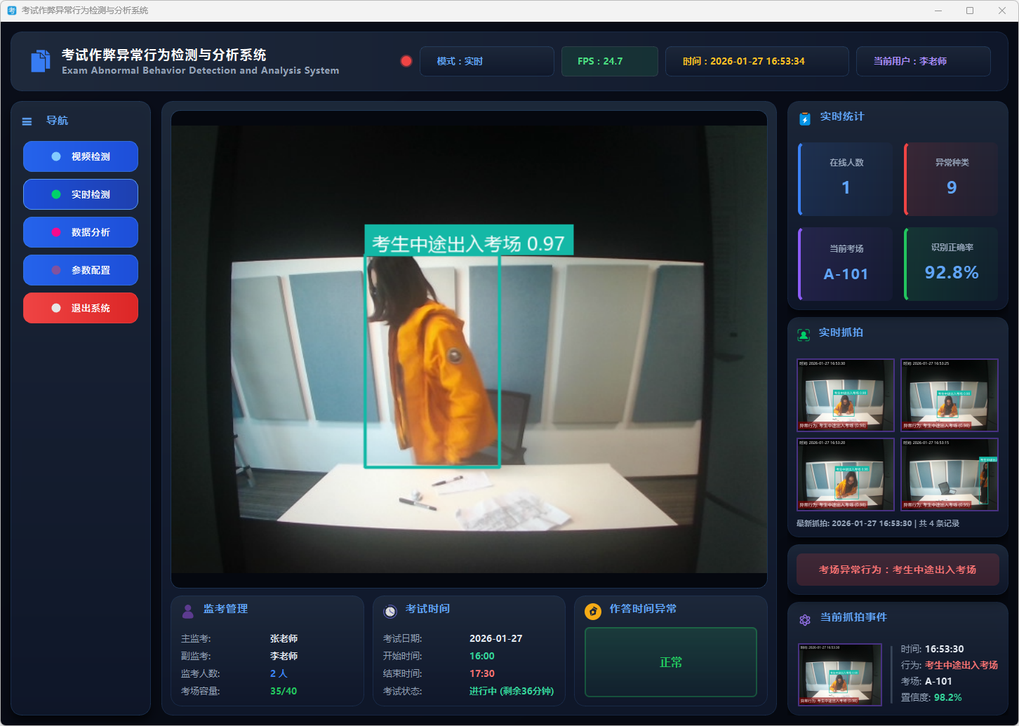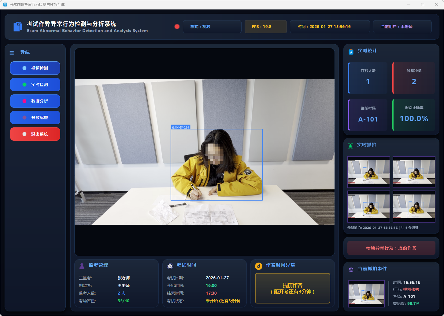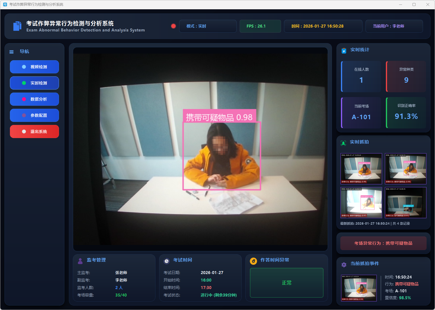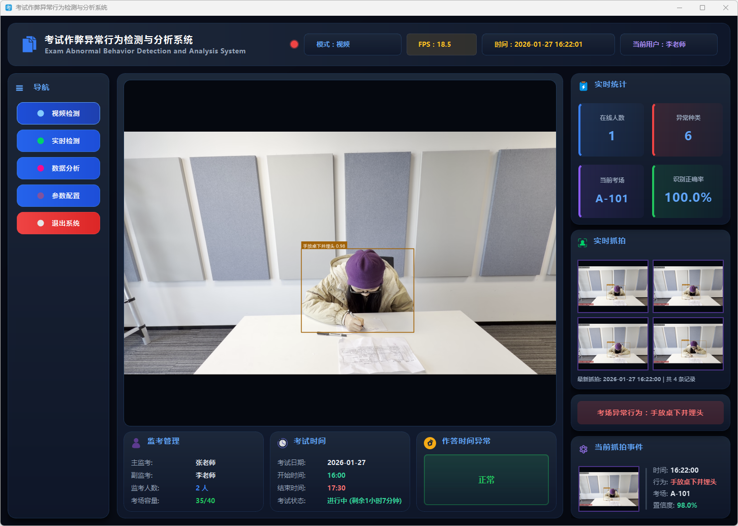 实验与测试结果表明,该系统在实际应用场景下能够较为准确地识别考场中的各类异常行为,检测准确率较高,平均帧率稳定在 30 FPS 以上,系统响应速度能够满足实时监控要求。整体系统界面友好、操作便捷,具有较强的实用性和推广价值,可为考试监考工作提供有效的技术支持,减轻监考人员工作负担,提高考试的公平性与规范性。