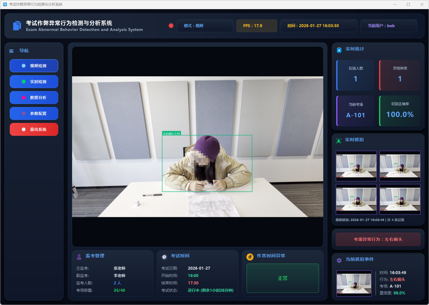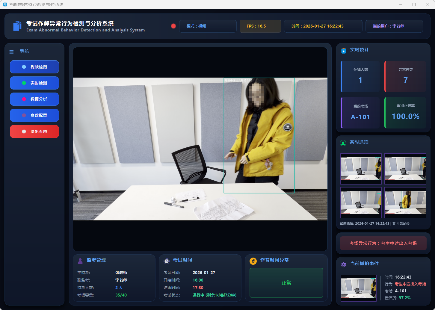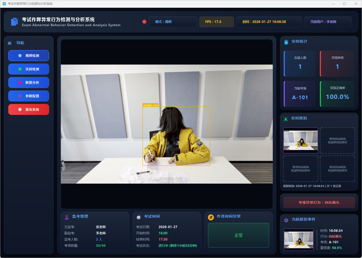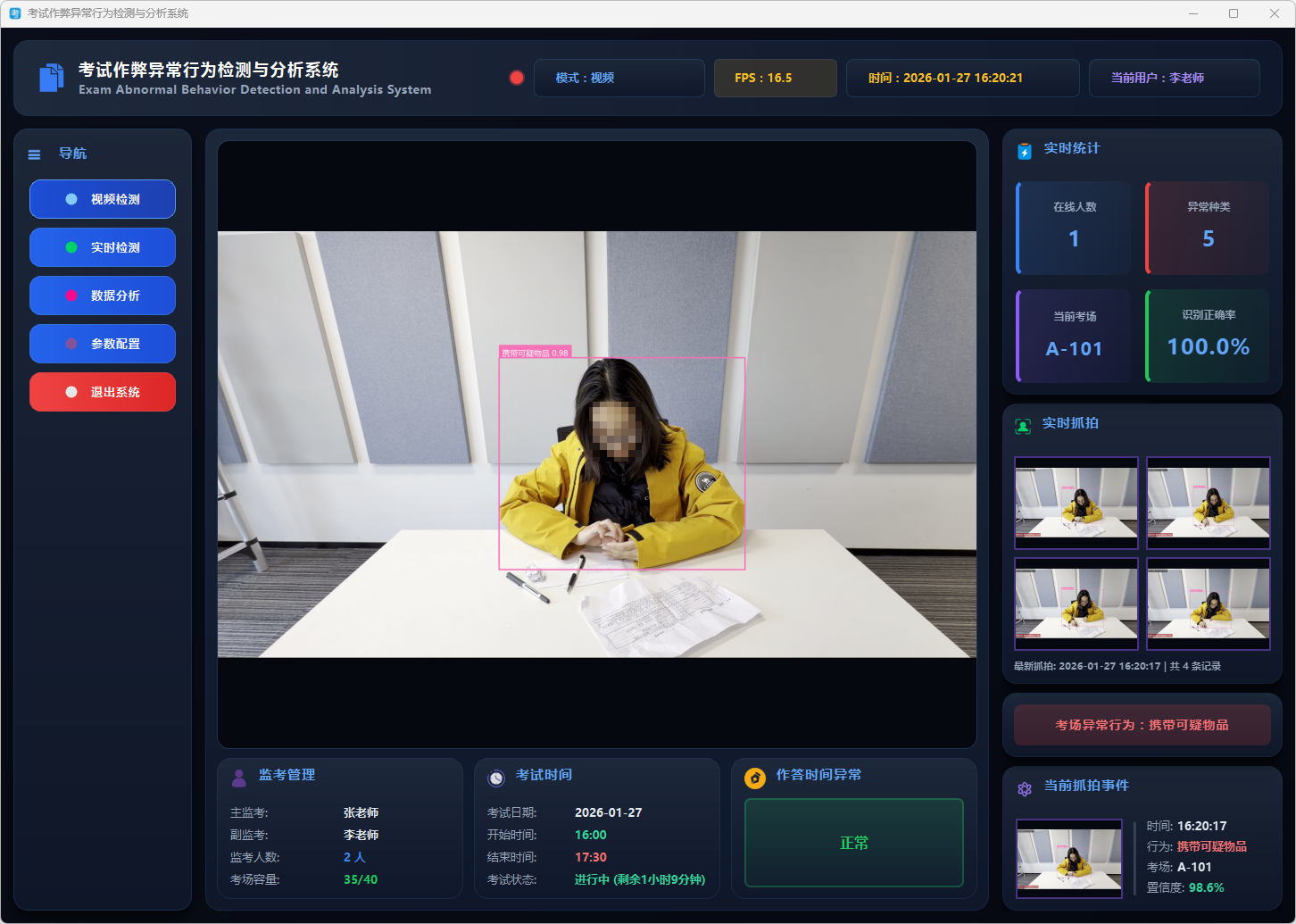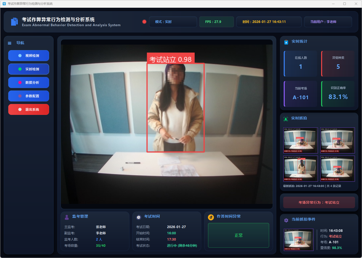 实验与测试结果表明,该系统在实际应用场景下能够较为准确地识别考场中的各类异常行为,检测准确率较高,平均帧率稳定在 30 FPS 以上,系统响应速度能够满足实时监控要求。整体系统界面友好、操作便捷,具有较强的实用性和推广价值,可为考试监考工作提供有效的技术支持,减轻监考人员工作负担,提高考试的公平性与规范性。