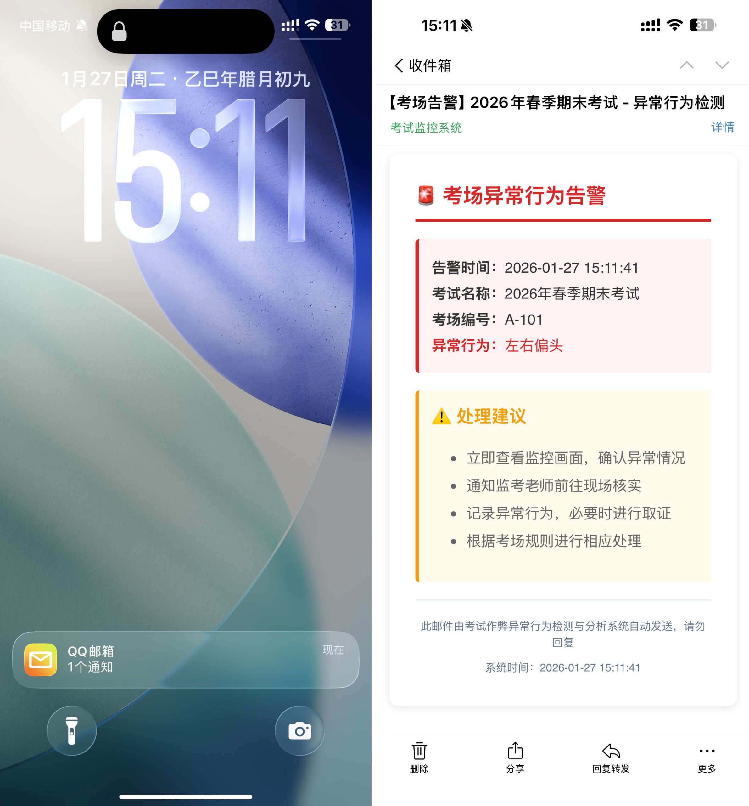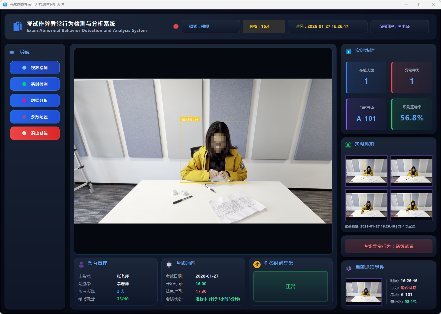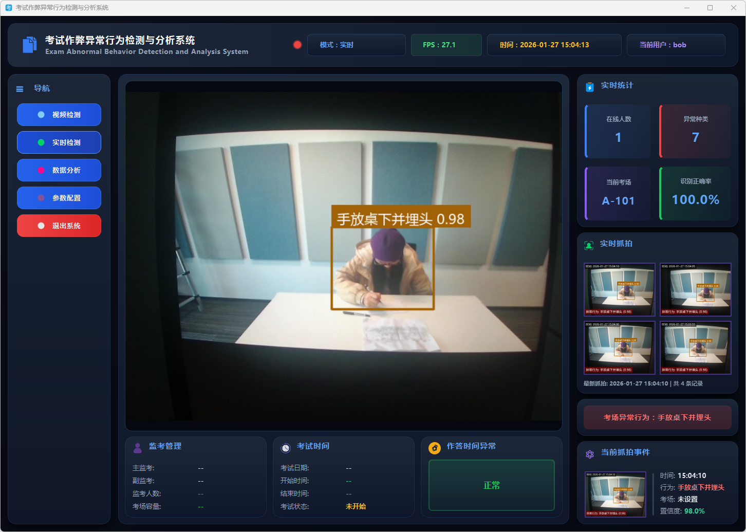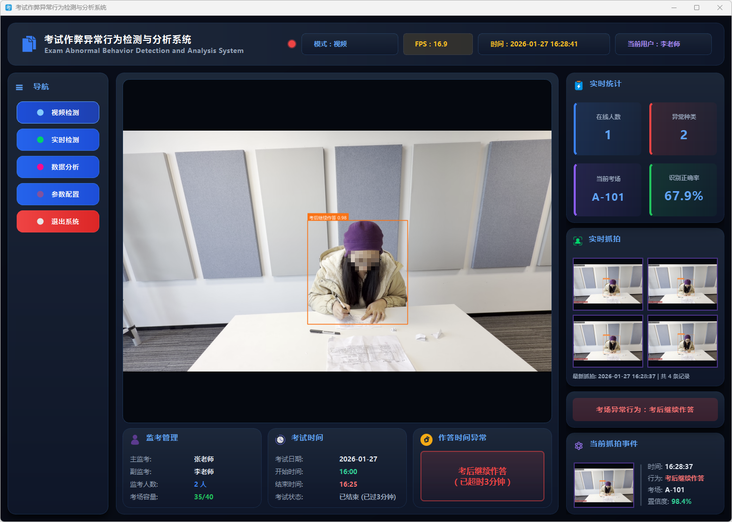 实验与测试结果表明,该系统在实际应用场景下能够较为准确地识别考场中的各类异常行为,检测准确率较高,平均帧率稳定在 30 FPS 以上,系统响应速度能够满足实时监控要求。整体系统界面友好、操作便捷,具有较强的实用性和推广价值,可为考试监考工作提供有效的技术支持,减轻监考人员工作负担,提高考试的公平性与规范性。