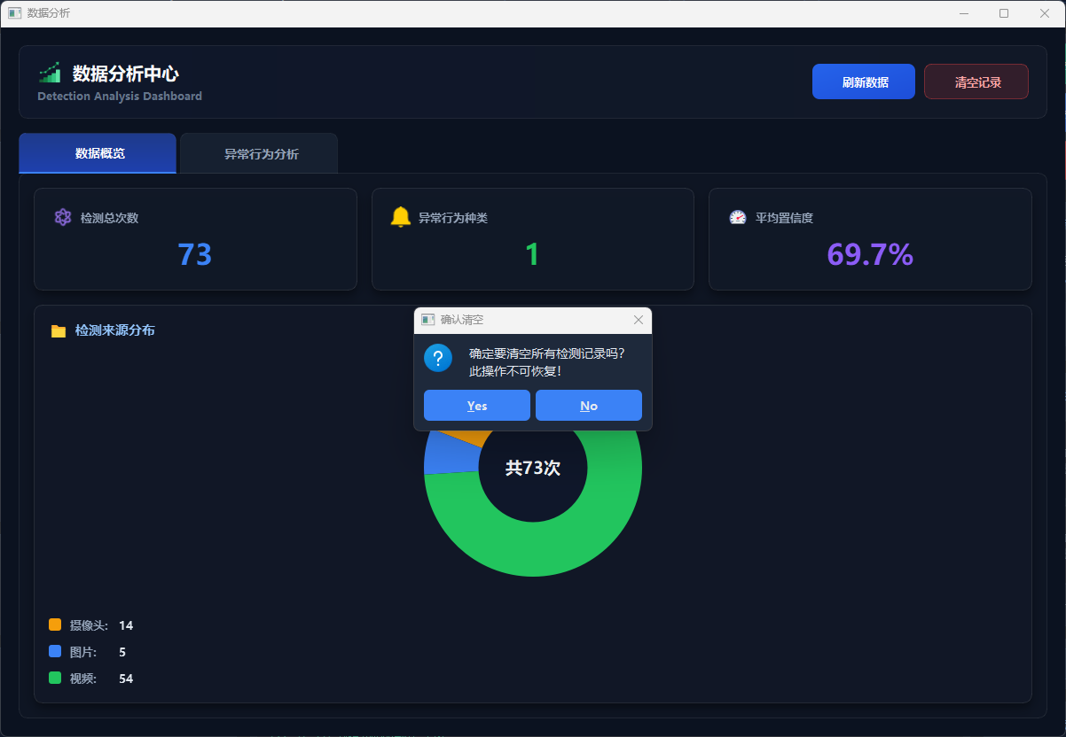 数据分析模块提供识别数据的可视化展示与统计分析功能。用户点击“数据分析”按钮即可打开独立分析窗口,查看检测总次数、检测频次、平均置信度等关键指标,并通过条形图、饼图和统计卡片等形式直观展示数据分布。模块包含数据概览、检测分析和详细统计等标签页,支持查询存储于 SQLite 数据库中的历史识别记录,查看检测来源分布(视频、摄像头、图片),并支持清空当前用户记录,实现识别数据的持久化存储与综合分析。