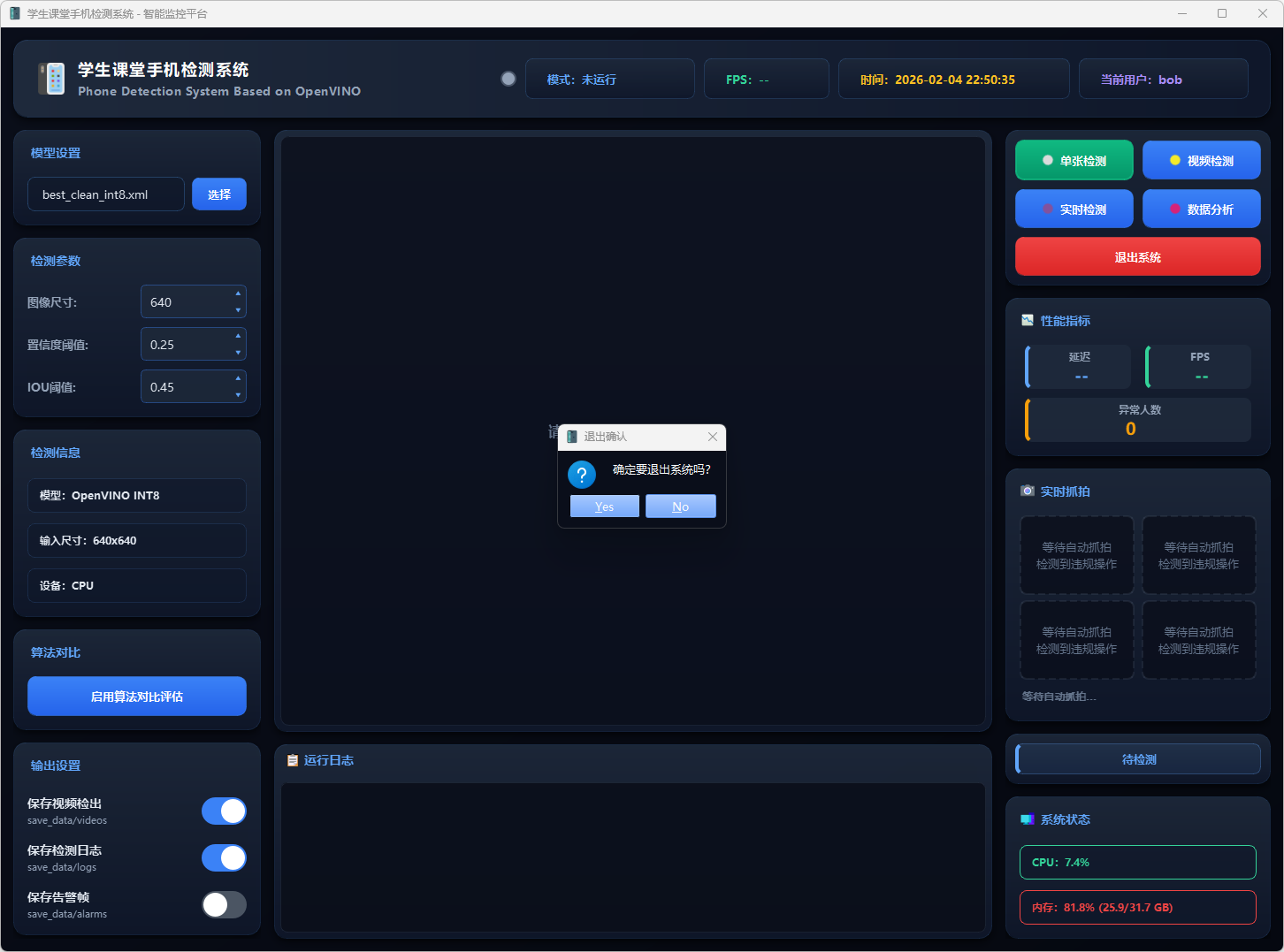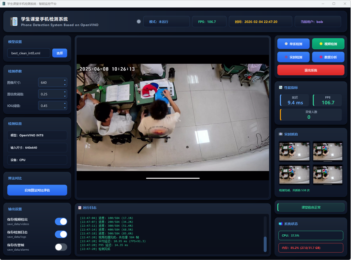 基于改进YOLOv5n与OpenVINO加速的课堂手机实时检测系统,支持单张图片、视频文件及摄像头多模式检测,可自动记录并导出检测结果。