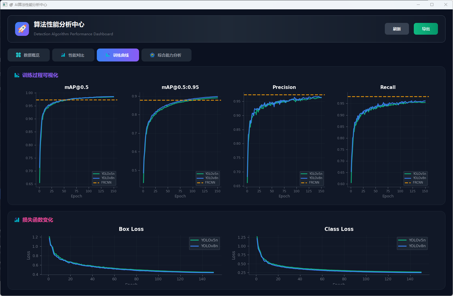 下图展示了模型在150轮训练过程中的完整性能变化,包括损失函数曲线和精度指标曲线:
