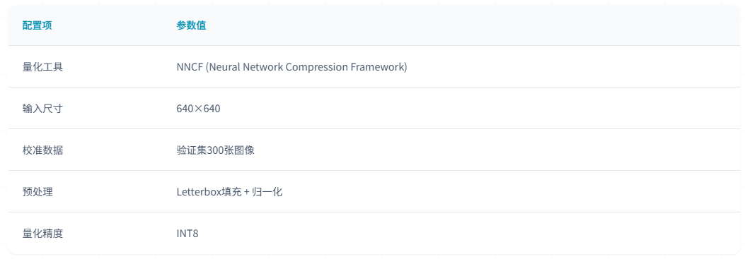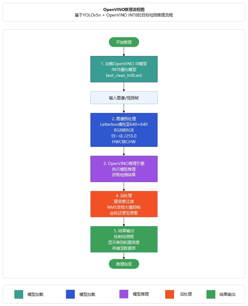 为实现模型在边缘设备上的高效部署,本研究采用Intel OpenVINO工具套件对YOLOv5n模型进行推理优化。OpenVINO是Intel推出 深度学习推理优化工具,支持模型压缩、量化和硬件加速,能够显著提升模型在Intel CPU、GPU等设备上的推理性能。优化目标 括:减小模型体积便于边缘设备部署,提升CPU推理速度降低对GPU的依赖,同时保持模型检测精度确保实用性。