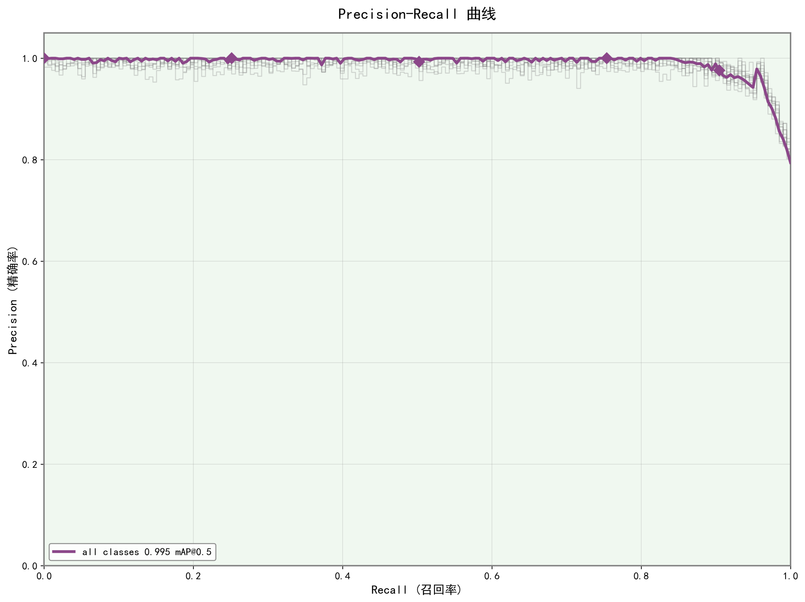 展示模型在不同置信度阈值下的精确率和召回率关系,all classes mAP@0.5达到0.995