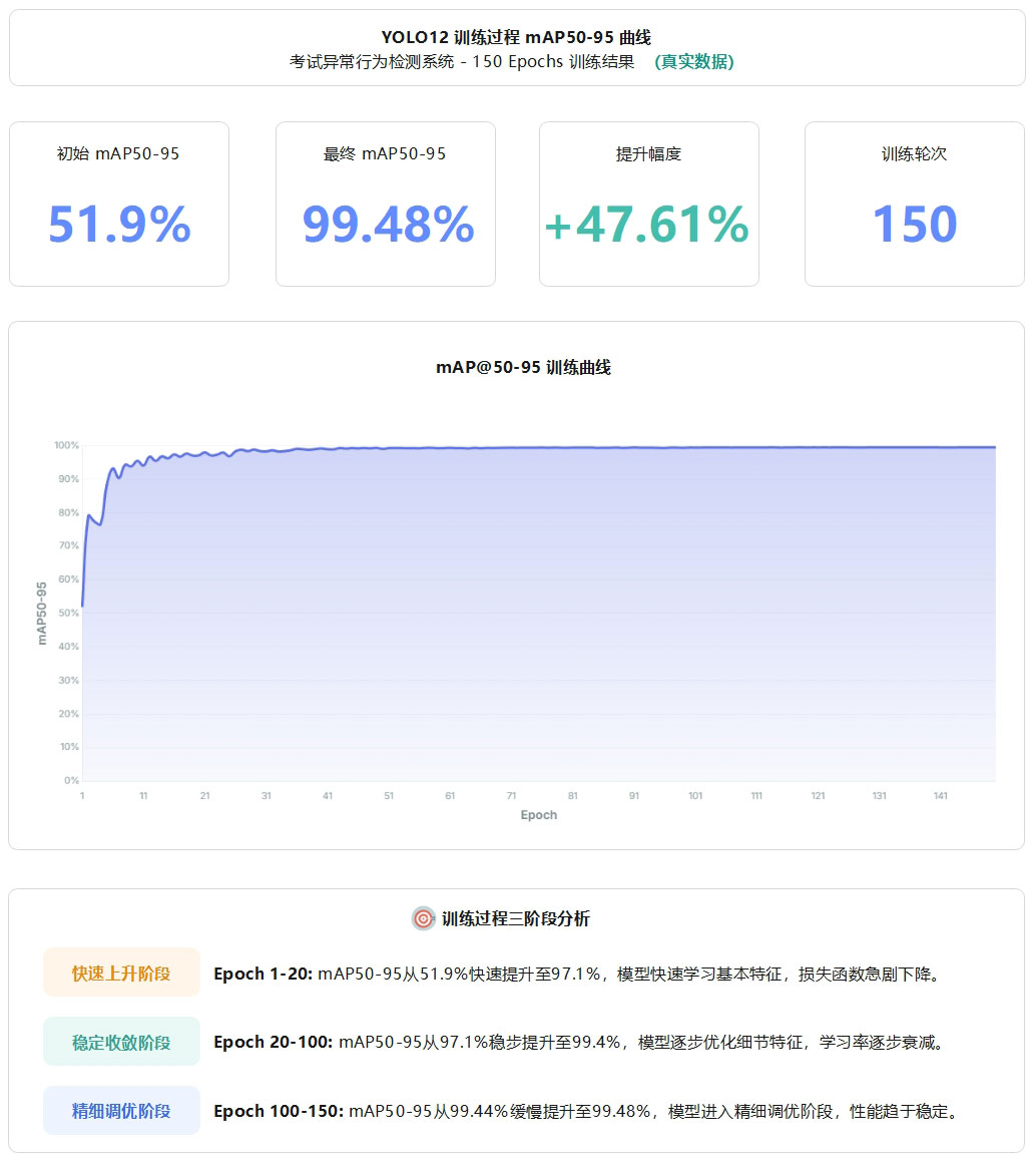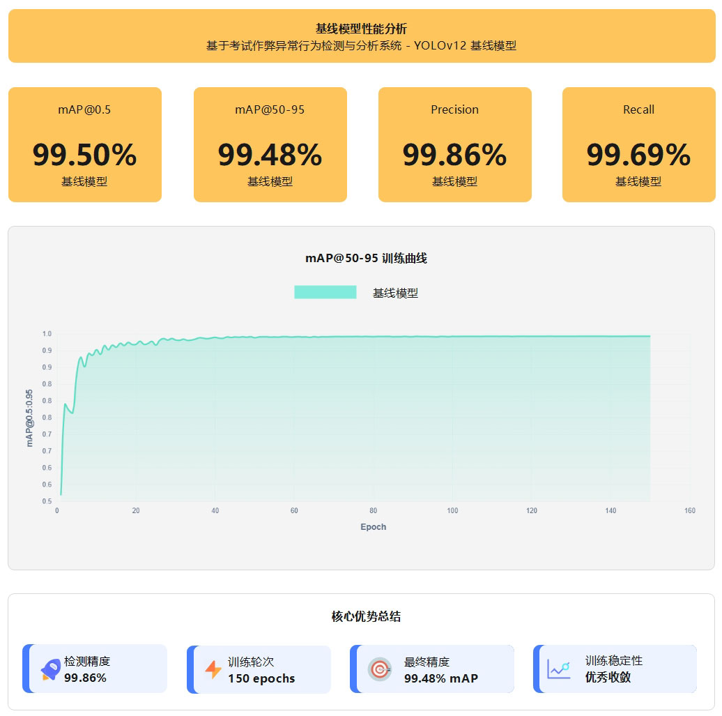 YOLO12 基线模型在考试异常行为检测任务上展现出卓越的综合性能。通过 2.6M 参数量和 6.7 GFLOPs 的轻量化设计,模型实现了 99.50% mAP@0.5 和 99.48% mAP@0.5:0.95 的高精度识别,精确率达到 99.86%,召回率达到 99.69%,误识别率和漏检率均控制在 0.5% 以内。经过 150 轮充分训练,模型在训练集和验证集上稳定收敛,mAP@0.5:0.95 从初始的 51.87% 提升至 99.48%,提升幅度达 47.61%,充分验证了模型的学习能力和泛化性能。该模型不仅精度高,而且支持 CPU/GPU 多平台部署,适合实时视频流处理和边缘设备应用,为考试异常行为智能检测系统提供了高效、可靠、易部署的技术解决方案