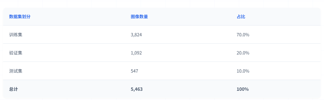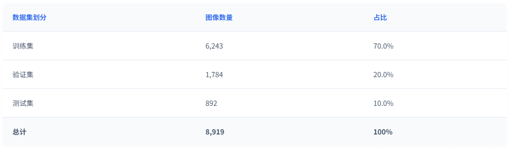 训练集用于模型的参数学习和特征提取能力训练。验证集用于训练过程中的性能监控和超参数调优,帮助选择最优模型。测试集用于最终的性能评估,确保模型在未见过的数据上具有良好的泛化能力。