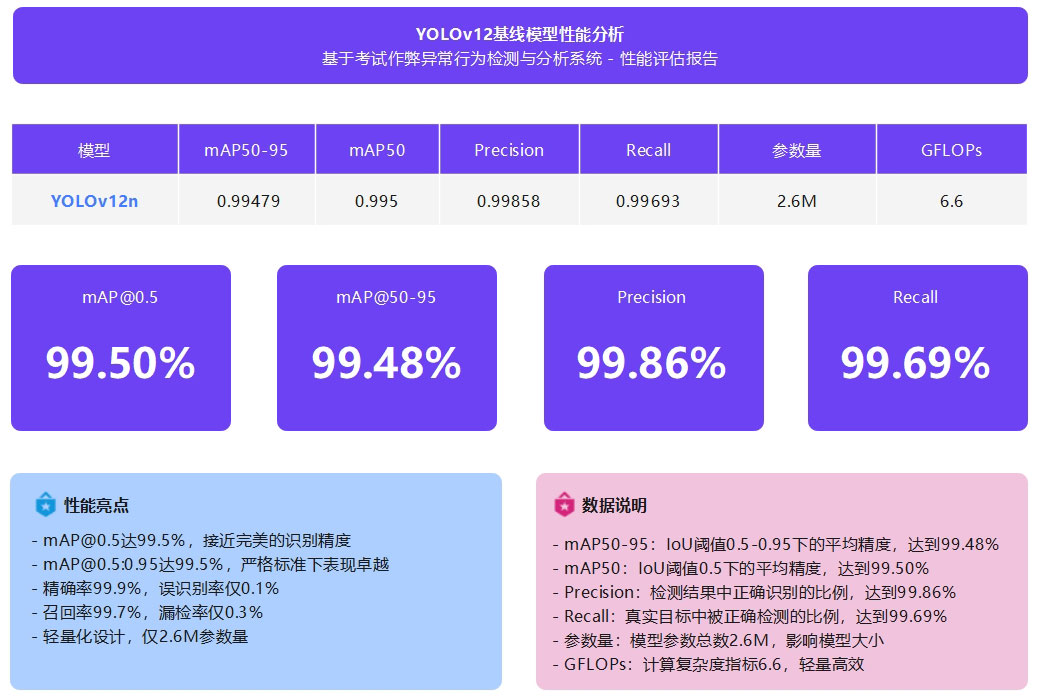 YOLO12n 基线模型以 2.6M 参数量、6.7 GFLOPs 计算量实现高效推理,在 考试异常行为检测任务 上达到 99.50% mAP@0.5 和 99.48% mAP@0.5:0.95 的卓越精度,精确率 99.86%,召回率 99.69%,支持 GPU 加速 和 CPU 部署,兼顾轻量化、高精度与实时性的完美平衡。