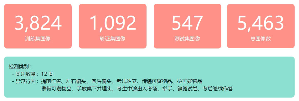 本研究使用的是考试异常行为检测数据集,该数据集专门针对考场环境中的考生异常行为进行标注。数据集包含多种考场场景下的图像,涵盖不同光照条件、不同拍摄角度和距离,包含12个异常行为类别(提前作答、左右偏头、向后偏头、考试站立、传递可疑物品、捡可疑物品、携带可疑物品、手放桌下并埋头、考生中途出入考场、举手、销毁试卷、考后继续作答),具有较强的场景多样性和实用价值。数据集共包含5,463张高质量标注图像,按照约7:2:1的比例划分为训练集(3,824张)、验证集(1,092张)和测试集(547张),为模型训练和评估提供了充足的数据支撑。