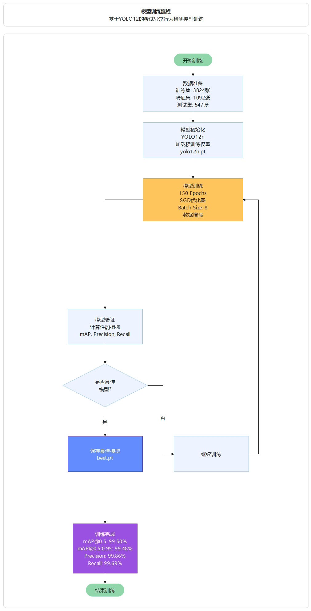 本章介绍了考试异常行为检测数据集的构建过程、模型训练流程与配置,以及YOLO12基线模型在验证集上达到99.50%的mAP@0.5和99.48%的mAP@0.5:0.95的卓越性能。数据集包含5,463张高质量标注图像(训练集3,824张、验证集1,092张、测试集547张),涵盖12个异常行为类别(提前作答、左右偏头、向后偏头、考试站立、传递可疑物品、捡可疑物品、携带可疑物品、手放桌下并埋头、考生中途出入考场、举手、销毁试卷、考后继续作答),经过150轮充分训练,模型精确率达99.86%、召回率达99.69%,展现出卓越的识别能力和实用价值。