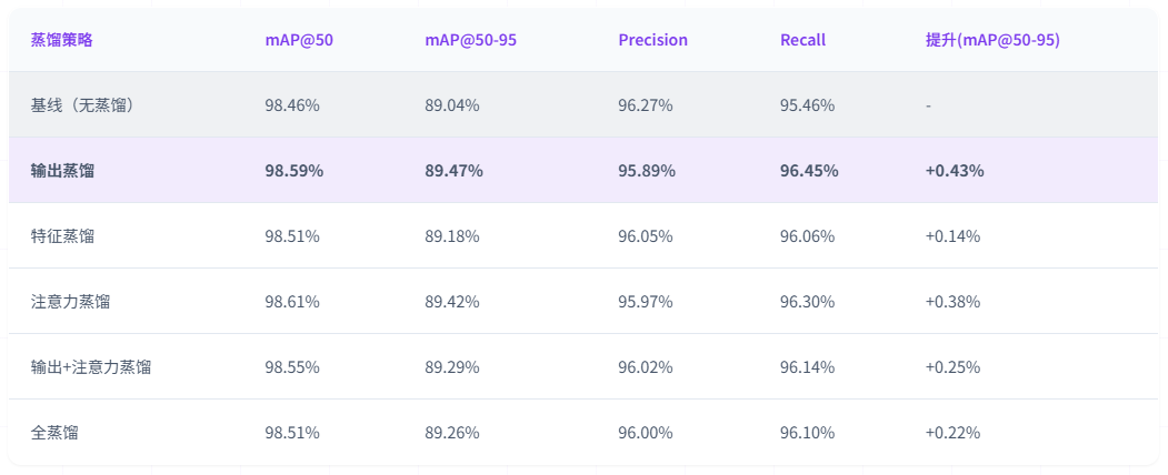 实验结果表明,输出蒸馏在mAP@50-95指标上取得最优结果89.47%,召回率提升至96.45%,相比基线提升0.99个百分点;注意力蒸馏在mAP@50指标上达到98.61%,表现最佳。