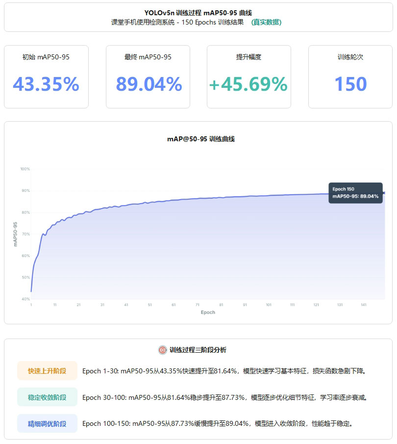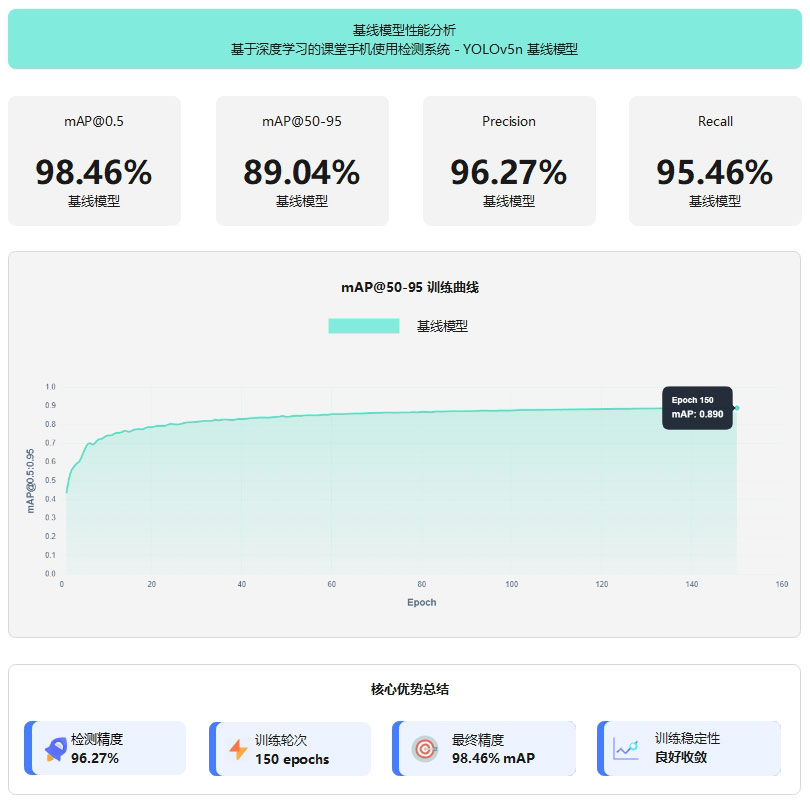 YOLOv5n 基线模型在仅 1.9M 参数量和 4.5 GFLOPs 计算量的条件下,在课堂手机使用检测任务中取得了 98.46% 的 mAP@0.5 和 89.04% 的 mAP@0.5:0.95,精确率与召回率分别达到 96.27% 和 95.46%。模型在 150 轮训练过程中表现出良好的收敛稳定性,整体性能提升幅度达 45.69%,同时支持 GPU 加速与 CPU 端部署,在保证检测精度的前提下兼顾轻量化与实时性,适合在边缘设备上部署,为课堂手机使用行为监测提供了一种高效可靠的技术方案。