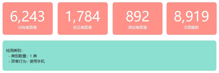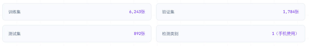 本研究采用课堂手机使用检测数据集,该数据集针对课堂环境中学生手机使用行为进行专门标注,涵盖不同光照条件、拍摄角度和拍摄距离等多种课堂场景,具有较强的场景多样性和实际应用价值。数据集共包含 8,919 张高质量标注图像,按约 7∶2∶1 的比例划分为训练集(6,243 张)、验证集(1,784 张)和测试集(892 张),为模型训练与性能评估提供了充足的数据支撑。