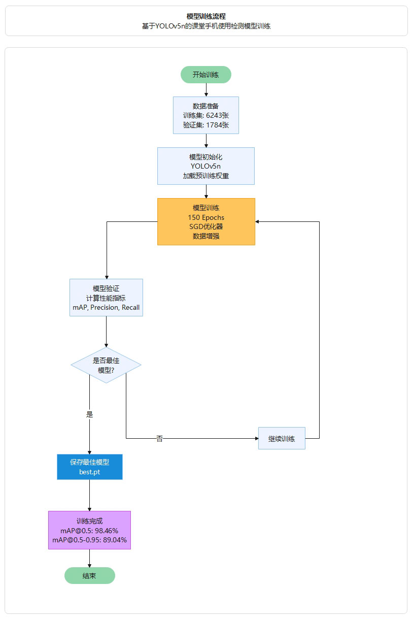 本章介绍了课堂手机使用检测数据集的构建过程、模型训练流程与参数配置,并对 YOLOv5n 基线模型的性能进行了评估。数据集共包含 8,027 张高质量标注图像(训练集 6,243 张,验证集 1,784 张),覆盖课堂手机使用行为类别。模型经过 150 轮训练后在验证集上取得 mAP@0.5 为 98.46%、mAP@0.5:0.95 为 89.04% 的检测性能,精确率和召回率分别达到 96.27% 和 95.46%,训练过程稳定收敛,表明该模型具有良好的识别能力和实际应用价值。