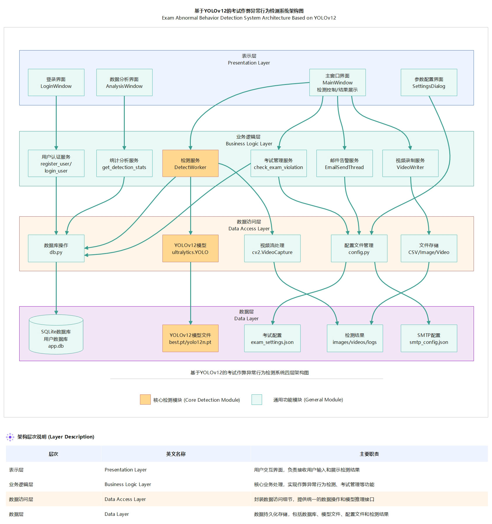 基于 YOLOv12 的考试作弊异常行为检测与分析系统,实现对考场视频中多类异常/作弊行为的实时识别、标注、统计分析与记录留存。