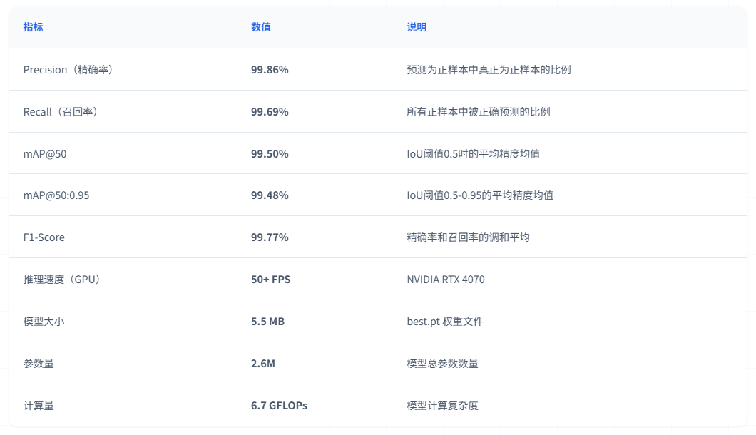 • 最终状态:模型在第150轮达到最佳性能,mAP50-95达到99.48%,训练过程稳定收敛