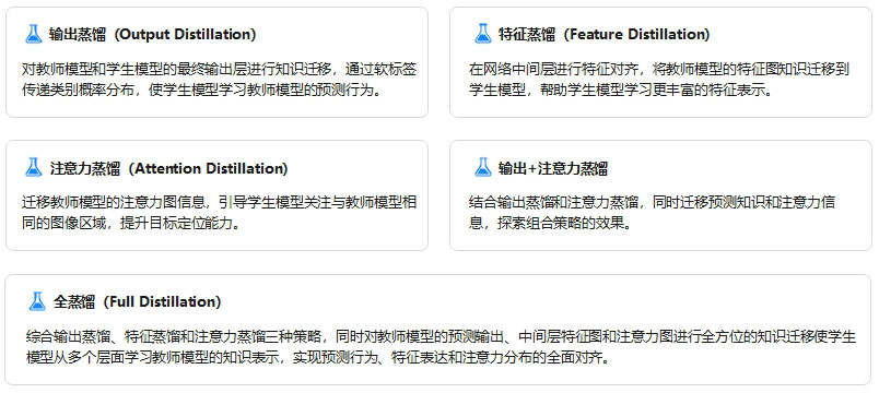 本研究设计了五种知识蒸馏策略,系统探索不同蒸馏方式对模型性能的影响:
