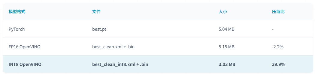 INT8量化后模型大小从5.04MB压缩至3.03MB,压缩率达39.9%,相比FP16减少41.2%的存储空间,量化后模型更适合边缘设备和嵌式系统部署