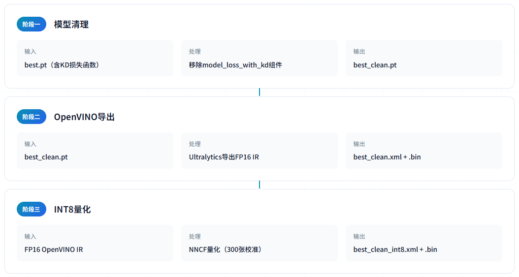 模型转换采用三阶段流程,首先清理知识蒸馏组件,然后导出为OpenVINO IR格式,最后进行INT8量化。