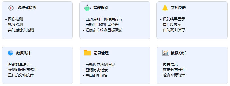 本系统提供单张检测、视频检测、实时检测、数据分析、参数配置五大核心功能,实现课堂手机检测的智能识别、实时监控、数据统计与可视化分析。
