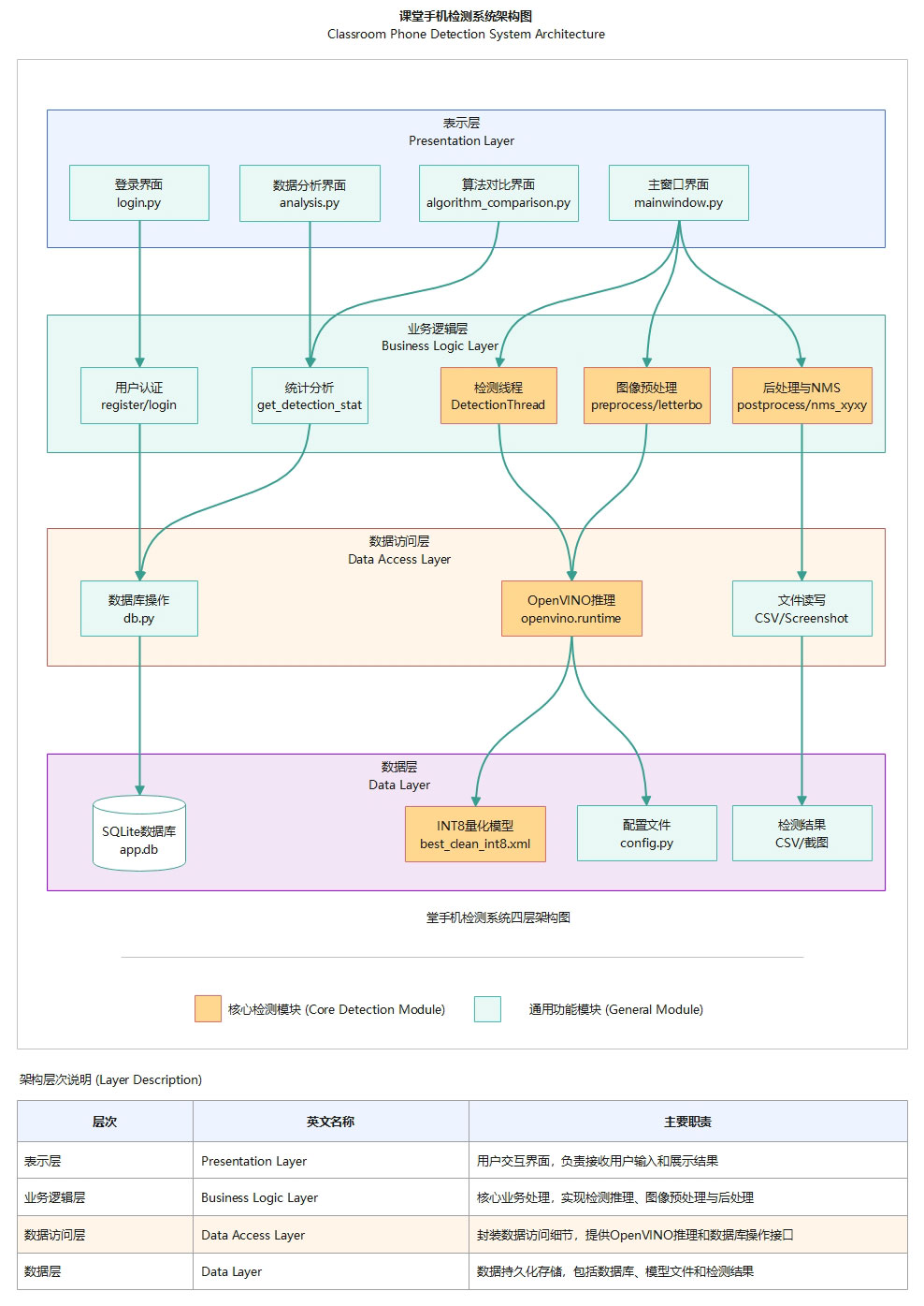 本系统采用PyQt5构建图形界面,集成OpenVINO推理引擎,支持图像、视频和摄像头三种检测模式,检测结果存储至SQLite数据库。