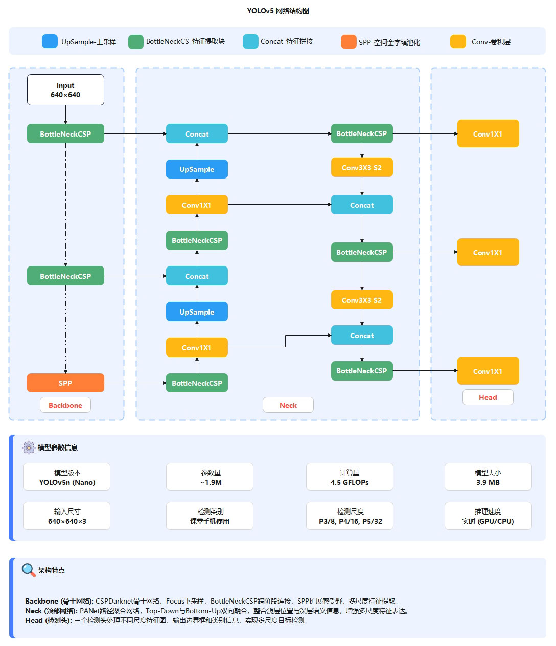 本系统采用 YOLOv5n(Nano)模型作为核心目标检测算法。YOLOv5 采用经典的 Backbone–Neck–Head 三段式网络架构,其中在 Backbone 部分,输入尺寸为 640×640 的图像首先经过卷积下采样操作,并基于 CSPDarknet 骨干网络逐步降低特征图分辨率、提升通道维度,实现从低层纹理信息到高层语义信息的多尺度特征提取;在 Neck 部分,采用 PANet 路径聚合网络结构,通过自顶向下与自底向上的双向特征融合机制,有效增强不同尺度特征之间的信息传递能力;最终在 Head 端输出 P3/8、P4/16 和 P5/32 三个尺度的特征图,分别用于小目标、中目标和大目标的检测,从而实现对课堂场景中手机目标的精准检测,为课堂手机使用行为分析提供技术支撑。