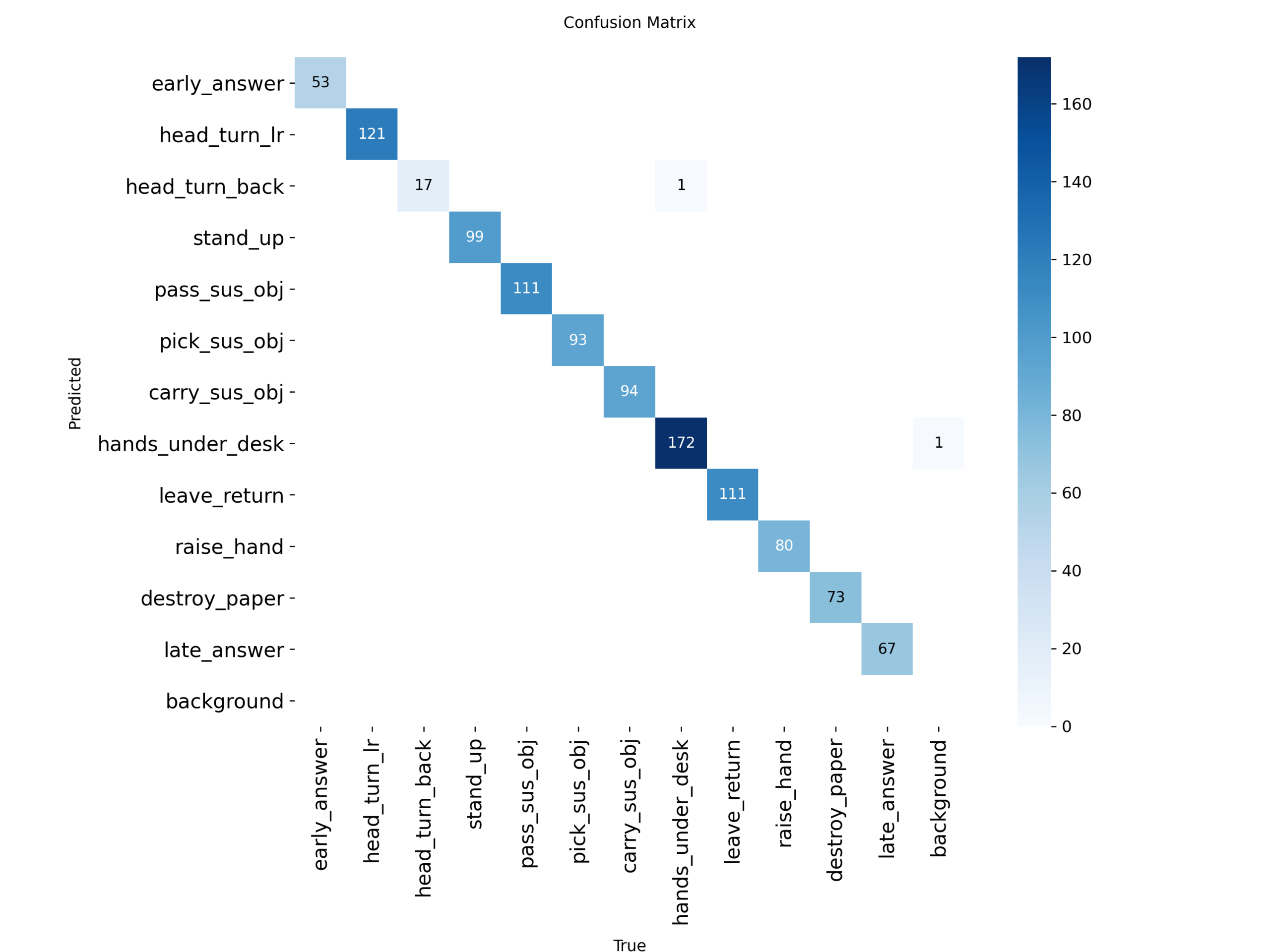 该曲线充分展示了模型在考试异常行为检测任务上的学习能力和收敛特性,验证了训练策略的有效性。最终,99.48% mAP@0.5:0.95 和 99.50% mAP@0.5 的表现证明了模型在严格评估标准下依然保持卓越的性能。