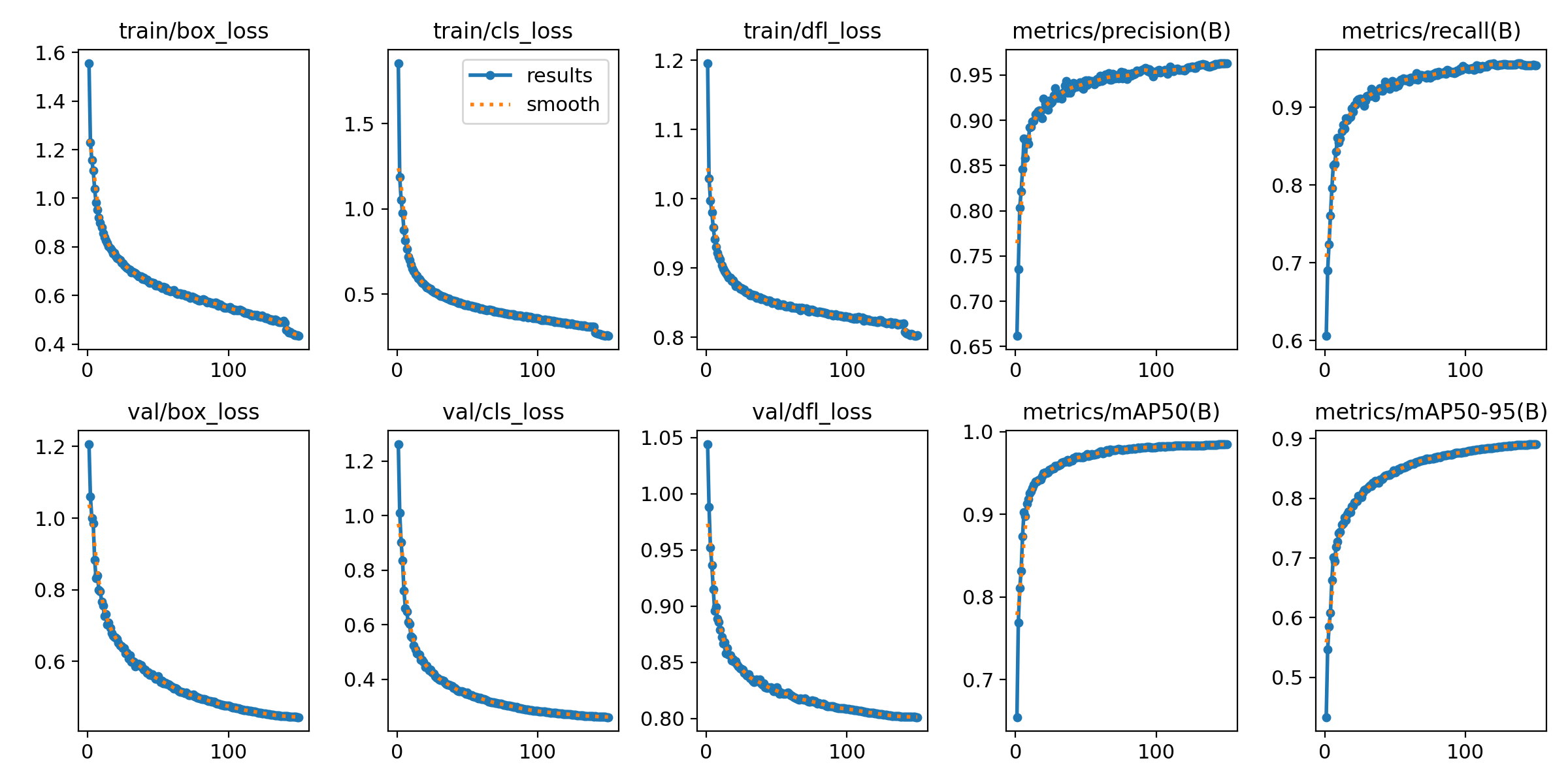 模型性能指标在训练过程中持续提升。Precision(精确率)曲线从初始值快速上升,最终稳定在96.27%的优秀水平;Recall(召回率)曲线稳步提升,最终达到95.46%,表明模型对目标的检测能力良好;mAP@50指标从初始的43.35%快速上升,在第30轮达到81.64%,最终稳定在98.46%,显示模型在IoU阈值为0.5时具有优秀的检测精度;mAP@50-95指标从初始的43.35%持续上升,经历快速上升阶段(1-30轮,提升至81.64%)、稳定提升阶段(30-100轮,提升至87.73%)和收敛稳定阶段(100-150轮),最终达到89.04%,表明模型在严格的IoU阈值范围(0.5至0.95)下仍能保持良好的检测性能,证明了模型定位精度的准确性。